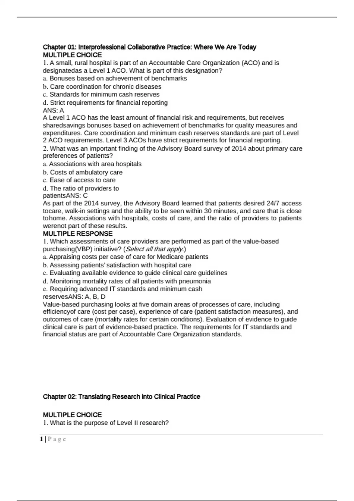Test Bank Primary Care Interprofessional Collaborative Practice 6th Edition ButtaroChapter 01: Interprofessional Collaborative Practice: Where We Are Today MULTIPLE CHOICE 1. A small, rural hospital is part of an Accountable Care Organization (ACO) and is designated as a Level 1 ACO. What is part of this designation? a. Bonuses based on achievement of benchmarks b. Care coordination for chronic diseases c. Standards for minimum cash reserves d. Strict requirements for financial reporting ANS: A A Level 1 ACO has the least amount of financial risk and requirements, but receives shared savings bonuses based on achievement of benchmarks for quality measures and expenditures. Care coordination and minimum cash reserves standards are part of Level 2 ACO requirements. Level 3 ACOs have strict requirements for financial reporting. 2. What was an important finding of the Advisory Board survey of 2014 about primary care preferences of patients? a. Associations with area hospitals b. Costs of ambulatory care c. Ease of access to care d. The ratio of providers to patients ANS: C As part of the 2014 survey, the Advisory Board learned that patients desired 24/7 access to care, walk-in settings and the ability to be seen within 30 minutes, and care that is close to home. Associations with hospitals, costs of care, and the ratio of providers to patients were not part of these results. MULTIPLE RESPONSE 1. Which assessments of care providers are performed as part of the value-based purchasing (VBP) initiative? (Select all that apply.) a. Appraising costs per case of care for Medicare patients b. Assessing patients’ satisfaction with hospital care c. Evaluating available evidence to guide clinical care guidelines d. Monitoring mortality rates of all patients with pneumonia e. Requiring advanced IT standards and minimum cash reserves ANS: A, B, D Value-based purchasing looks at five domain areas of processes of care, including efficiency of care (cost per case), experience of care (patient satisfaction measures), and outcomes of care (mortality rates for certain conditions). Evaluation of evidence to guide clinical care is part of evidence-based practice. The requirements for IT standards and financial status are part of Accountable Care Organization standards. Chapter 02: Translating Research into Clinical Practice MULTIPLE CHOICE 1. What is the purpose of Level II research? 1 | P a g ea. To define characteristics of interest of groups of patients b. To demonstrate the effectiveness of an intervention or treatment c. To describe relationships among characteristics or variables d. To evaluate the nature of relationships between two variables ANS: C Level II research is concerned with describing the relationships among characteristics or variables. Level I research is conducted to define the characteristics of groups of patients. Level II research evaluates the nature of the relationships between variables. Level IV research is conducted to demonstrate the effectiveness of interventions or treatments. 2. Which is the most appropriate research design for a Level III research study? a. Epidemiological studies b. Experimental design c. Qualitative studies d. Randomized clinical trials ANS: B The experimental design is the most appropriate design for a Level III study. Epidemiological studies are appropriate for Level II studies. Qualitative designs are useful for Level I studies. Randomized clinical trials are used for Level IV studies. 3. What is the purpose of clinical research trials in the spectrum of translational research? a. Adoption of interventions and clinical practices into routine clinical care b. Determination of the basis of disease and various treatment options c. Examination of safety and effectiveness of various interventions d. Exploration of fundamental mechanisms of biology, disease, or behavior ANS: C Clinical research trials are concerned with determining the safety and effectiveness of interventions. Adoption of interventions and practices is part of clinical implementation. Determination of the basis of disease and treatment options is part of the preclinical research phase. Exploration of the fundamental mechanisms of biology, disease, or behavior is part of the basic research stage. Chapter 03: Empowering Patients as Collaborative partners: A New Model for Primary Care MULTIPLE CHOICE 1. Which statement made by a health care provider demonstrates the most appropriate understanding for the goal of a performance report? a. “This process allows me to critique the performance of the rest of the staff.” b. “Most organizations require staff to undergo a performance evaluation yearly.” c. “It is hard to be personally criticized but that’s how we learn to change.” d. “The comments should help me improve my management skills.” ANS: D The goal of the performance report is to provide guidance to staff in the areas of professional development, mentoring, and leadership development. A peer review is written by others who perform similar skills (peers). The remaining options may be true but 2 | P a g edo not provide evidence of understanding of the goal of this professional requirement. MULTIPLE RESPONSE 1. Which assessment question would a health care provider ask when engaging in the previsit stage of the new model for primary care? (Select all that apply.) a. “Are you ready to discuss some of the community resources that are available?” b. “Are you experiencing any side effects from your newly prescribed medications?” c. “Do you anticipate any problems with adhering to your treatment plan?” d. “Are you ready to discuss the results of your laboratory tests?” e. “Do you have any questions about the lab tests that have been ordered for you?” ANS: B, C, E The nursing responsibilities in the previsit stage include assessing the patient’s tolerance of prescribed medications, understanding of existing treatment plan, and education about required lab testing. T