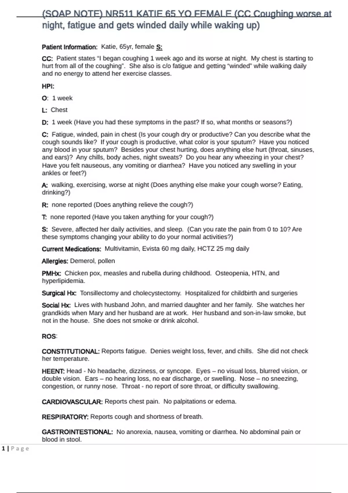 (SOAP NOTE) NR511 KATIE 65 YO FEMALE (CC Coughing worse at night, fatigue and gets winded daily while walking)
