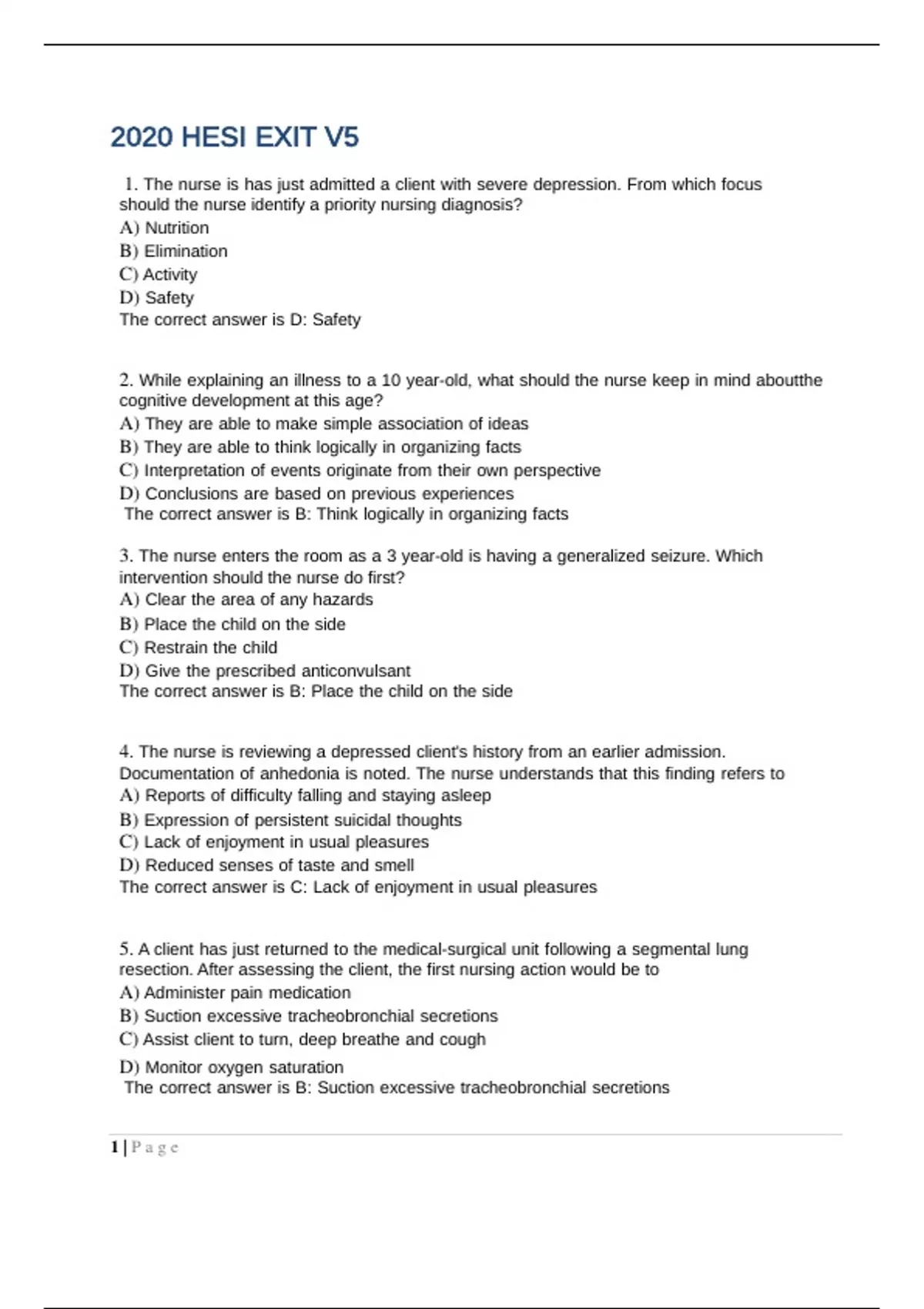Hesi Exit V5 COMPLETE 160 QUESTION AND ANSWERS1. The nurse is has just admitted a client with severe depression. From which focus should the nurse identify a priority nursing diagnosis? A) Nutrition B) Elimination C) Activity D) Safety The correct answer is D: Safety 2. While explaining an illness to a 10 year-old, what should the nurse keep in mind about the cognitive development at this age? A) They are able to make simple association of ideas B) They are able to think logically in organizing facts C) Interpretation of events originate from their own perspective D) Conclusions are based on previous experiences The correct answer is B: Think logically in organizing facts 3. The nurse enters the room as a 3 year-old is having a generalized seizure. Which intervention should the nurse do first? A) Clear the area of any hazards B) Place the child on the side C) Restrain the child D) Give the prescribed anticonvulsant The correct answer is B: Place the child on the side 4. The nurse is reviewing a depressed client's history from an earlier admission. Documentation of anhedonia is noted. The nurse understands that this finding refers to A) Reports of difficulty falling and staying asleep B) Expression of persistent suicidal thoughts C) Lack of enjoyment in usual pleasures D) Reduced senses of taste and smell The correct answer is C: Lack of enjoyment in usual pleasures 5. A client has just returned to the medical-surgical unit following a segmental lung resection. After assessing the client, the first nursing action would be to A) Administer pain medication B) Suction excessive tracheobronchial secretions C) Assist client to turn, deep breathe and cough D) Monitor oxygen saturation The correct answer is B: Suction excessive tracheobronchial secretions 1 | P a g e6. While assessing a client in an outpatient facility with a panic disorder, the nurse completes a thorough health history and physical exam. Which finding is most significant for this client? A) Compulsive behavior B) Sense of impending doom C) Fear of flying D) Predictable episodes The correct answer is B: Sense of impending doom 7. A 16 month-old child has just been admitted to the hospital. As the nurse assigned to this child enters the hospital room for the first time, the toddler runs to the mother, clings to her and begins to cry. What would be the initial action by the nurse? A) Arrange to change client care assignments B) Explain that this behavior is expected C) Discuss the appropriate use of "time-out" D) Explain that the child needs extra attention The correct answer is B: Explain that this behavior is expected 8. A 15 year-old client with a lengthy confining illness is at risk for altered growth and development of which task? A) Loss of control B) Insecurity C) Dependence D) Lack of trust The correct answer is C: Dependence 9. Which playroom activities should the nurse organize for a small group of 7 year-old hospitalized children? A) Sports and games with rules B) Finger paints and water play C) "Dress-up" clothes and props D) Chess and television programs The correct answer is A: Sports and games with rules 10. The nurse is discussing dietary intake with an adolescent who has acne. The most appropriate statement for the nurse is A) "Eat a balanced diet for your age." B) "Increase your intake of protein and Vitamin A." C) "Decrease fatty foods from your diet." D) "Do not use caffeine in any form, including chocolate." The correct answer is A: "Eat a balanced diet for your age." 2 | P a g e11. The nurse is assigned to a newly delivered woman with HIV/AIDS. The student asks the nurse about how it is determined that a person has AIDS other than a positive HIV test. The nurse responds A) "The complaints of at least 3 common findings." B) "The absence of any opportunistic infection." C) "CD4 lymphocyte count is less than 200." D) "Developmental delays in children." The correct answer is C: "CD4 lymphocyte count is less than 200." 12. The nurse is caring for a child who has just returned from surgery following a tonsillectomy and adenoidectomy. Which action by the nurse is appropriate? A) Offer ice cream every 2 hours B) Place the child in a supine position C) Allow the child to drink through a straw D) Observe swallowing patterns The correct answer is D: Observe swallowing patterns 13. A 23 year-old single client is in the 33rd week of her first pregnancy. She tells the nurse that she has everything ready for the baby and has made plans for the first weeks together at home. Which normal emotional reaction does the nurse recognize? A) Acceptance of the pregnancy B) Focus on fetal development C) Anticipation of the birth D) Ambivalence about pregnancy The correct answer is C: Anticipation of the birth 14. The nurse is planning care for a client with pneumococcal pneumonia. Which of the following would be most effective in removing respiratory secretions? A) Administration of cough suppressants B) Increasing oral fluid intake to 3000 cc per day C) Maintaining bed rest with bathroom privileges D) Performing chest physiotherapy twice a day The correct answer is B: Increasing oral fluid intake to 3000 cc per day 15. The nurse in a well-child clinic examines many children on a daily basis. Which of the following toddlers requires further follow up? A) A 13 month-old unable to walk B) A 20 month-old only using 2 and 3 word sentences C) A 24 month-old who cries during examination D) A 30 month-old only drinking from a sip cup The correct answer is D: A 30 month-old only drinking from a sip cup 16. Which of the following would be the best strategy for the nurse to use when teaching 3 | P a g einsulin injection techniques to a newly diagnosed client with diabetes? A) Give written pre and post tests B) Ask questions during practice C) Allow another diabetic to assist D) Observe a return demonstration The correct answer is D: Observe a return demonstration 17. A client has developed thrombophlebitis of the left leg. Which nursing interve