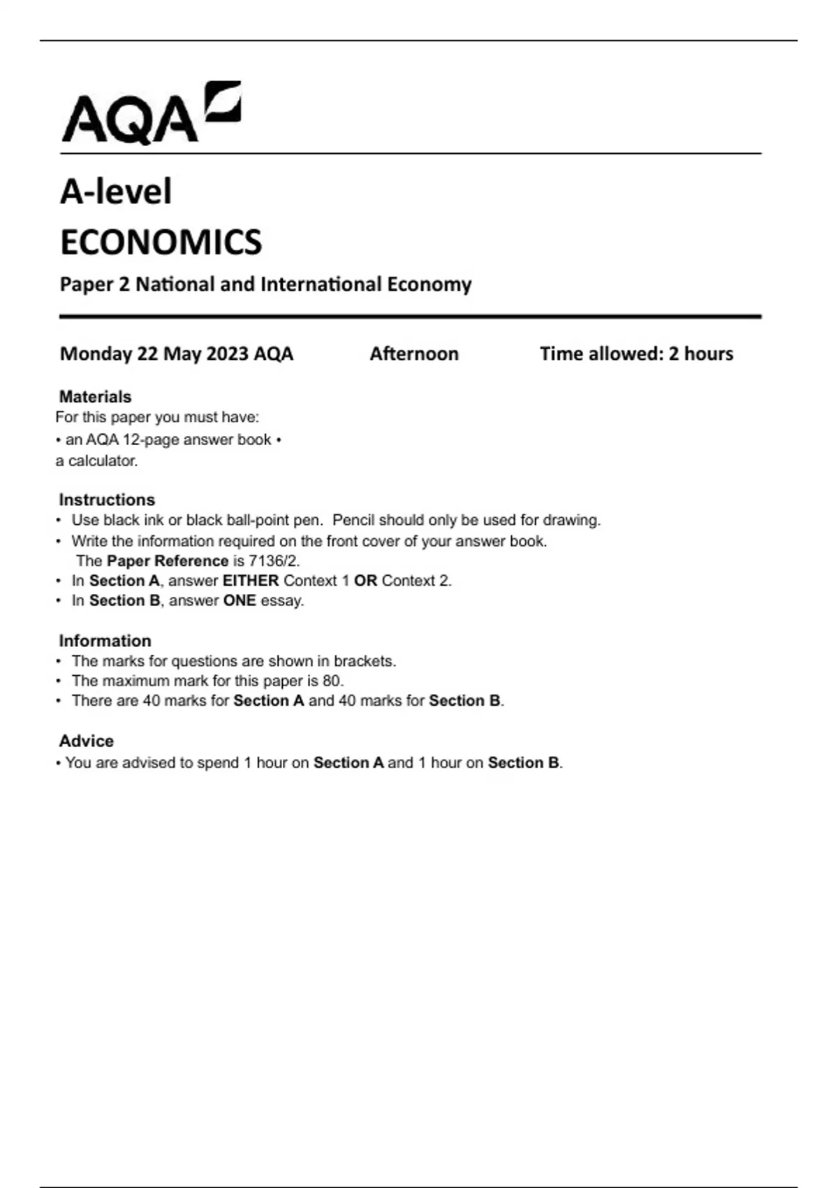 AQA A-level ECONOMICS Paper 2 National and International Economy 7136-2-QP-Economics-A-22May23