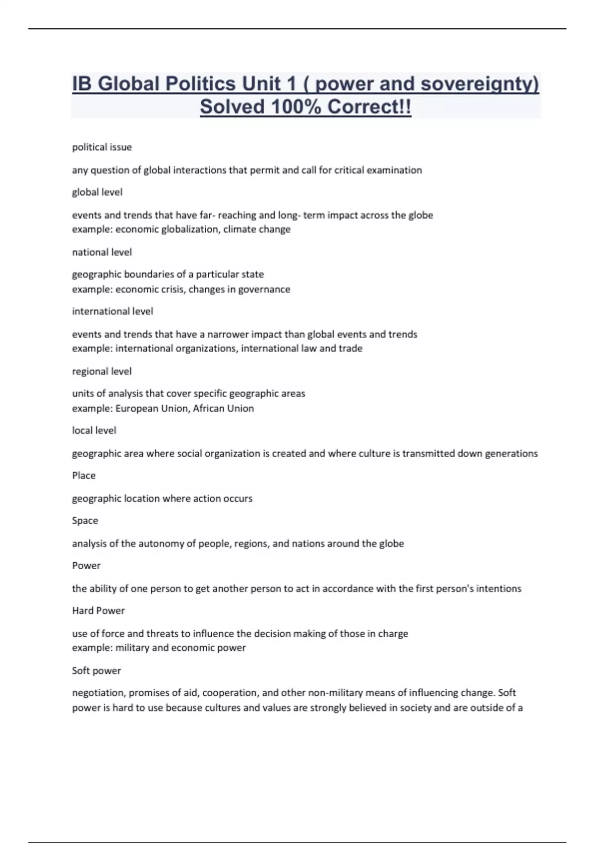 IB Global Politics Unit 1 ( power and sovereignty) Solved 100% Correct!!