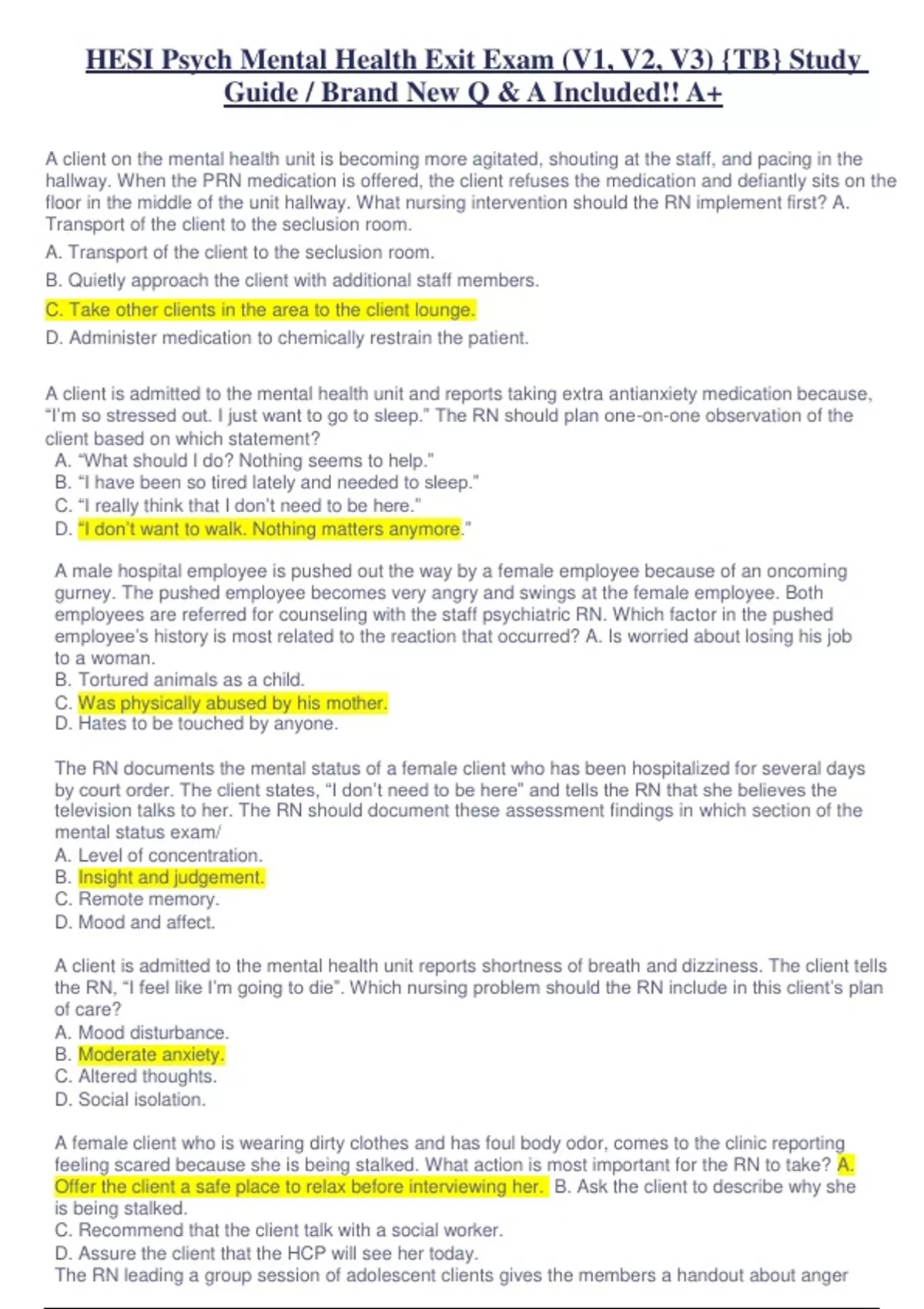 HESI Psych Mental Health Exit Exam (V1, V2, V3) {TB} Study Guide / Brand New Q & A Included!! A+ HESI Psych Mental Health Exit Exam (V1, V2, V3) {TB} Study Guide / Brand New Q & A Included!! A+