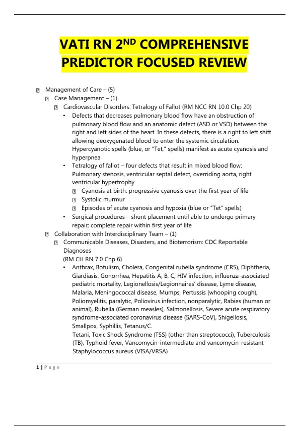 VATI RN 2ND COMPREHENSIVE PREDICTOR FOCUSED REVIEWManagement of Care – (5) Case Management – (1) Cardiovascular Disorders: Tetralogy of Fallot (RM NCC RN 10.0 Chp 20) • Defects that decreases pulmonary blood flow have an obstruction of pulmonary blood flow and an anatomic defect (ASD or VSD) between the right and left sides of the heart. In these defects, there is a right to left shift allowing deoxygenated blood to enter the systemic circulation. Hypercyanotic spells (blue, or “Tet,” spells) manifest as acute cyanosis and hyperpnea • Tetralogy of fallot – four defects that result in mixed blood flow: Pulmonary stenosis, ventricular septal defect, overriding aorta, right ventricular hypertrophy Cyanosis at birth: progressive cyanosis over the first year of life Systolic murmur Episodes of acute cyanosis and hypoxia (blue or “Tet” spells) • Surgical procedures – shunt placement until able to undergo primary repair; complete repair within first year of life Collaboration with Interdisciplinary Team – (1) Communicable Diseases, Disasters, and Bioterrorism: CDC Reportable Diagnoses (RM CH RN 7.0 Chp 6) • Anthrax, Botulism, Cholera, Congenital rubella syndrome (CRS), Diphtheria, Giardiasis, Gonorrhea, Hepatitis A, B, C, HIV infection, influenza-associated pediatric mortality, Legionellosis/Legionnaires’ disease, Lyme disease, Malaria, Meningococcal disease, Mumps, Pertussis (whooping cough), Poliomyelitis, paralytic, Poliovirus infection, nonparalytic, Rabies (human or animal), Rubella (German measles), Salmonellosis, Severe acute respiratory syndrome-associated coronavirus disease (SARS-CoV), Shigellosis, Smallpox, Syphillis, Tetanus/C. Tetani, Toxic Shock Syndrome (TSS) (other than streptococci), Tuberculosis (TB), Typhoid fever, Vancomycin-intermediate and vancomycin-resistant Staphylococcus aureus (VISA/VRSA) 1 | P a g eConcepts of Management – (1) Managing Client Care: Conflict Management Between Health Care Workers (RM Leadership 7.0 Chp 1) • Conflict is the result of opposing thoughts, ideas, feelings, perceptions, behaviors, values, opinions, or actions between individuals. Conflict is an inevitable part of professional, social, and personal life and can have constructive or destructive results. Nurses must understand conflict and how to manage it. Nurses can use problem-solving and negotiation strategies to prevent a problem from evolving into a conflict. Lack of conflict can create organizational stasis, while too much conflict can be demoralizing, produce anxiety, and contribute to burnout. Conflict can disrupt working relationships and create a stressful atmosphere. If conflict exists to the level that productivity and quality of care are compromised, the unit manager must attempt to identify the origin of the conflict and attempt to resolve it. Continuity of Care – (1) Information Technology: Change-of-Shift Report (RM FUND 9.0 Chp 5) • Nurses give this report at the conclusion of each shift ot the nurse assuming responsibility for the clients. Formats include face to face, audiotaping, or presentation during walking rounds in each client’s room (unless the client has a roommate or visitors are present). An effective report should: include significant objective information about the client’s health problems, proceed in a logical sequence, include no gossip or personal opinion, and relate recent changes in medications, treatments, procedures, and the discharge plan. Establishing Priorities – (1) Managing Client Care: Prioritizing Care of Postoperative Clients (RM Leadership 7.0 Chp 1) • Prioritize systemic before local (“life before limb”) • Prioritize acute (less opportunity for physical adaptation) before chronic (greater opportunity for physical adaptation) • Prioritize actual problems before potential future problems • Listen carefully to clients and don’t assume • Recognize and respond to trends vs. transient findings • Recognize indications of medical emergencies and complications vs. expected findings• Apply clinical knowledge to procedural standards to determine the priority actions Safety and Infection Control – (8) Accident/Error/Injury Prevention – (1) Seizures: Maintaining Seizure Precautions (RM NCC RN 10.0 Chp 13) • Maintain seizure precautions, including placing the bed in the lowest position and padding the side rails to prevent future injury. Emergency Response Plan – (1) Client Safety: Priority Action for Fire (RM FUND 9.0 Chp 12) • R: rescue and protect clients in close proximity to the fire by moving them to a safer location. Clients who are ambulatory may walk independently in a safe location • A: alarm: activate the facility’s alarm system and then report the fire’s details and location • C: contain/confine the fire by closing doors and windows and turning off any sources of oxygen and any electrical devices. Ventilate clients who are on life support with a bag valve mask • E: extinguish the fire is possible using the appropriate fire extinguisher Handling Hazardous and Infectious Materials – (1) Cancer Treatment Options: Implanted Internal Radiation Device (RM AMS RN 10.0 Chp 91) • Brachytherapy describes internal radiation that is placed close to the target tissue. This is done via placement in a body orifice (vagina) or body cavity (abdomen) or delivered via IV such as with radionuclide iodine, which is absorbed by the thyroid. Brachytherapy provides radiation to the tumor and a limited amount to surrounding normal tissues. Waste products are radioactive until the isotope has been completely eliminated from the body. Waste products should not be touched by anyone. Nursing considerations: Place the client in a private room away from other clients when possible. Keep door closed as much as possible. Place a sign on the door warning of the radiation source. Wear a dosimeter film badge that records personal amount of radiation exposure. Limit visitors to 30-min visits, and ha