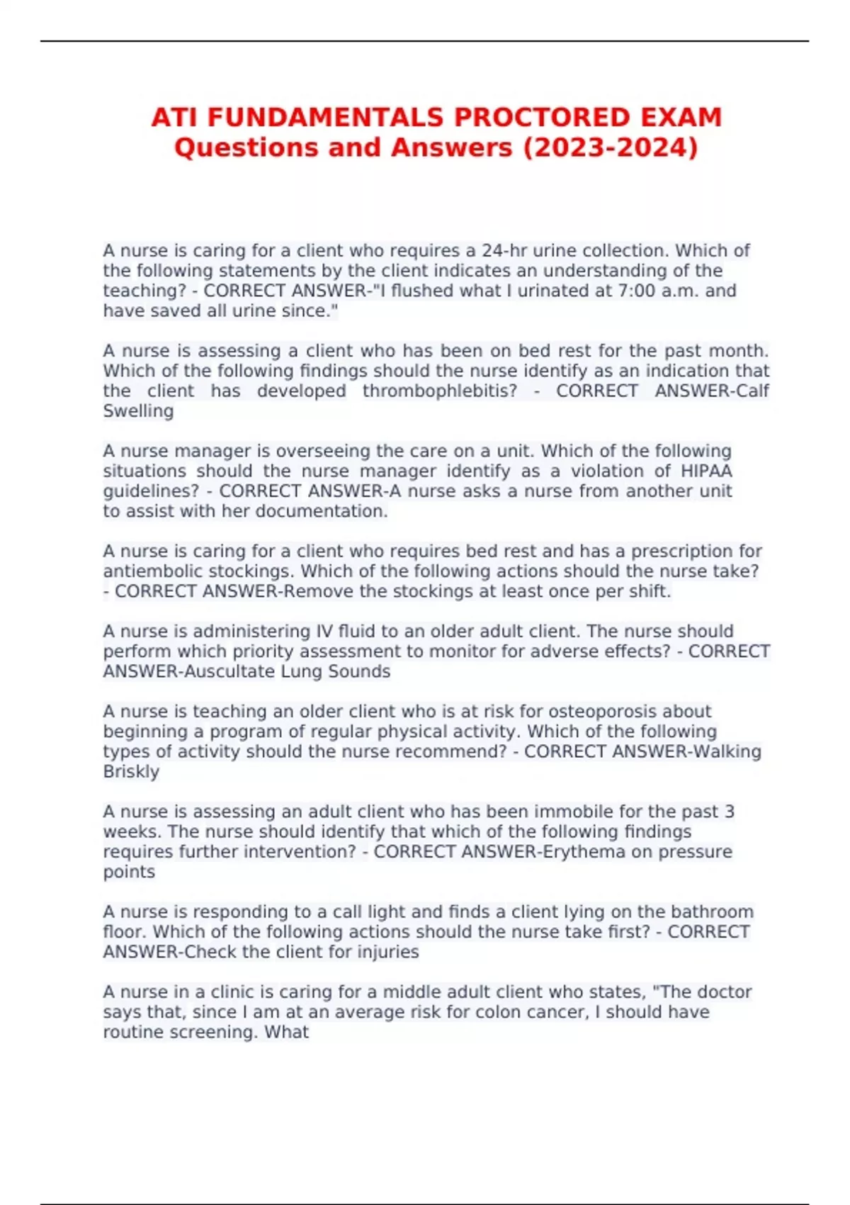 ATI FUNDAMENTALS PROCTORED EXAM Questions and Answers () A nurse is caring for a client who requires a 24-hr urine collection. Which of the following statements by the client indicates an understanding of the teaching? - CORRECT ANSWER-"I flushed what I urinated at 7:00 a.m. and have saved all urine since."