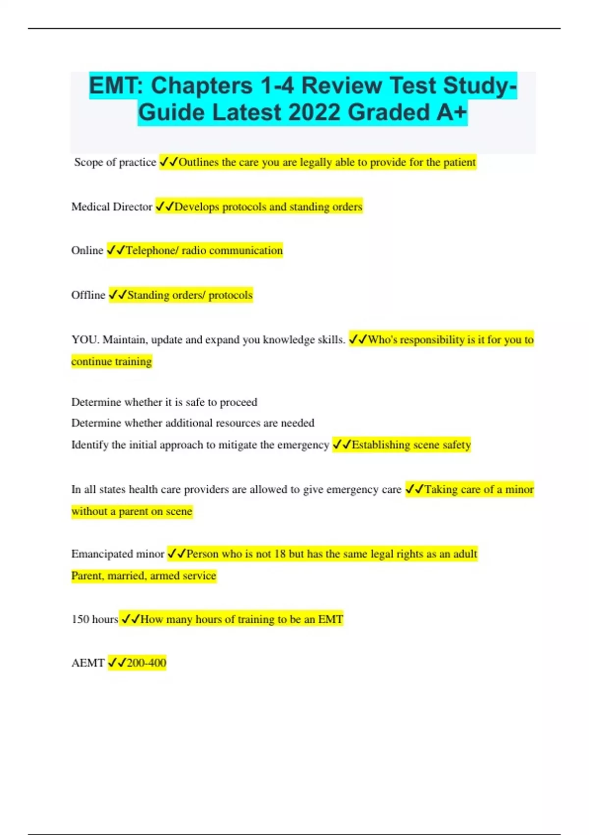 Scope of practice Outlines the care you are legally able to provide for the patient Medical Director Develops protocols and standing orders Online Telephone/ radio communication Offline Standing orders/ protocols YOU. Maintain, update and expand you knowledge skills. Who's responsibility is it for you to continue training Determine whether it is safe to proceed Determine whether additional resources are needed Identify the initial approach to mitigate the emergency Establishing scene safety In all states health care providers are allowed to give emergency care Taking care of a minor without a parent on scene Emancipated minor Person who is not 18 but has the same legal rights as an adult Parent, married, armed service 150 hours How many hours of training to be an EMT AEMT 200-400