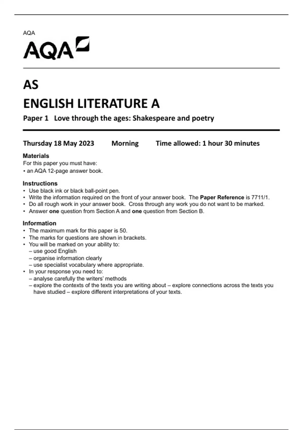AQA AS ENGLISH LITERATURE A Paper 1 Love through the ages: Shakespeare and poetry 7711-1-QP-EnglishLiteratureA-A-18May23