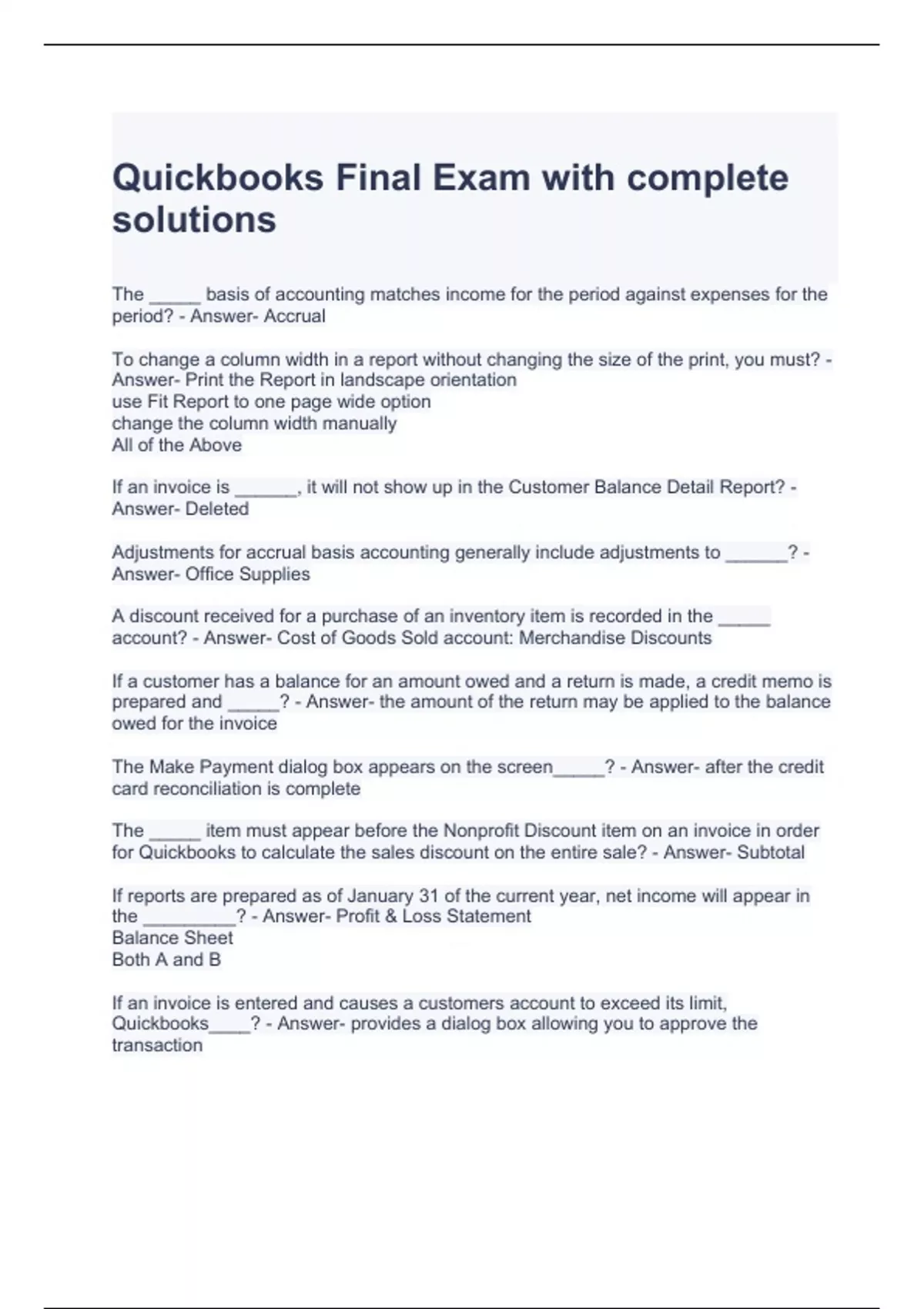 Quickbooks Final Exam with complete solutions