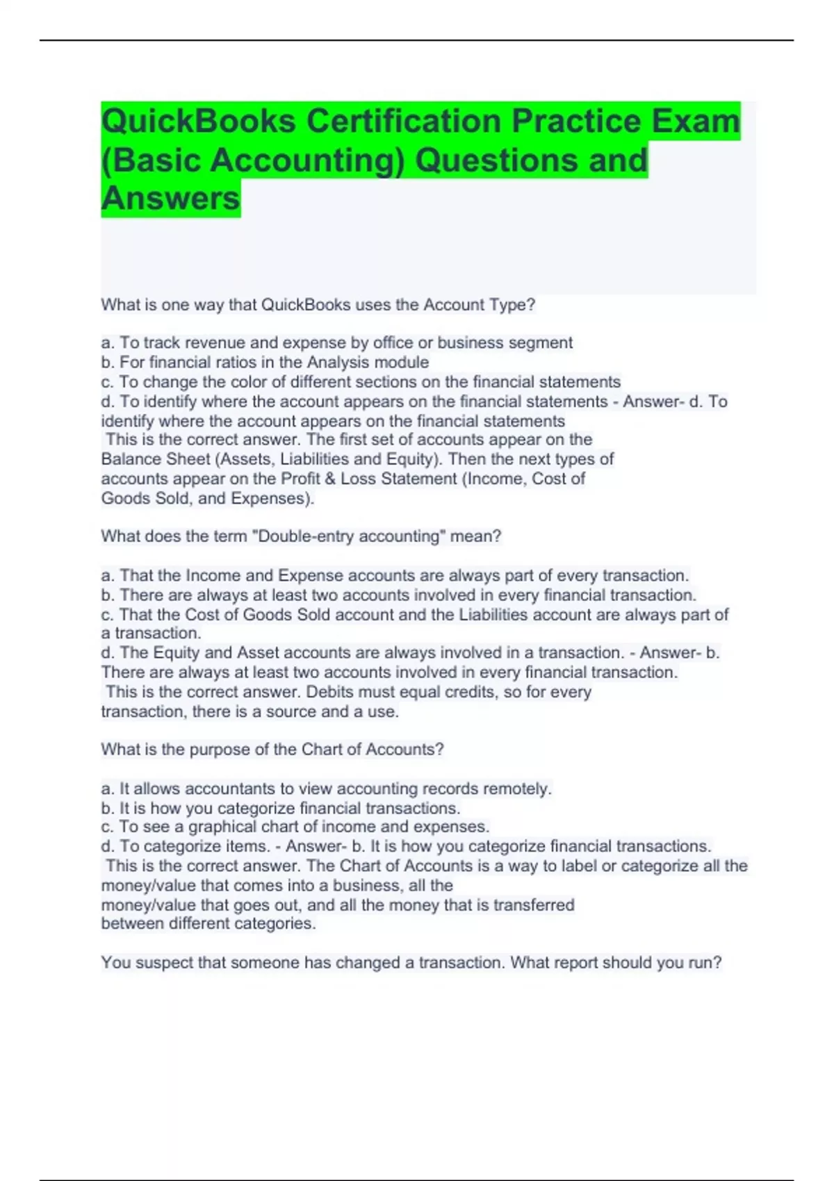 QuickBooks Certification Practice Exam (Basic Accounting) Questions and Answers
