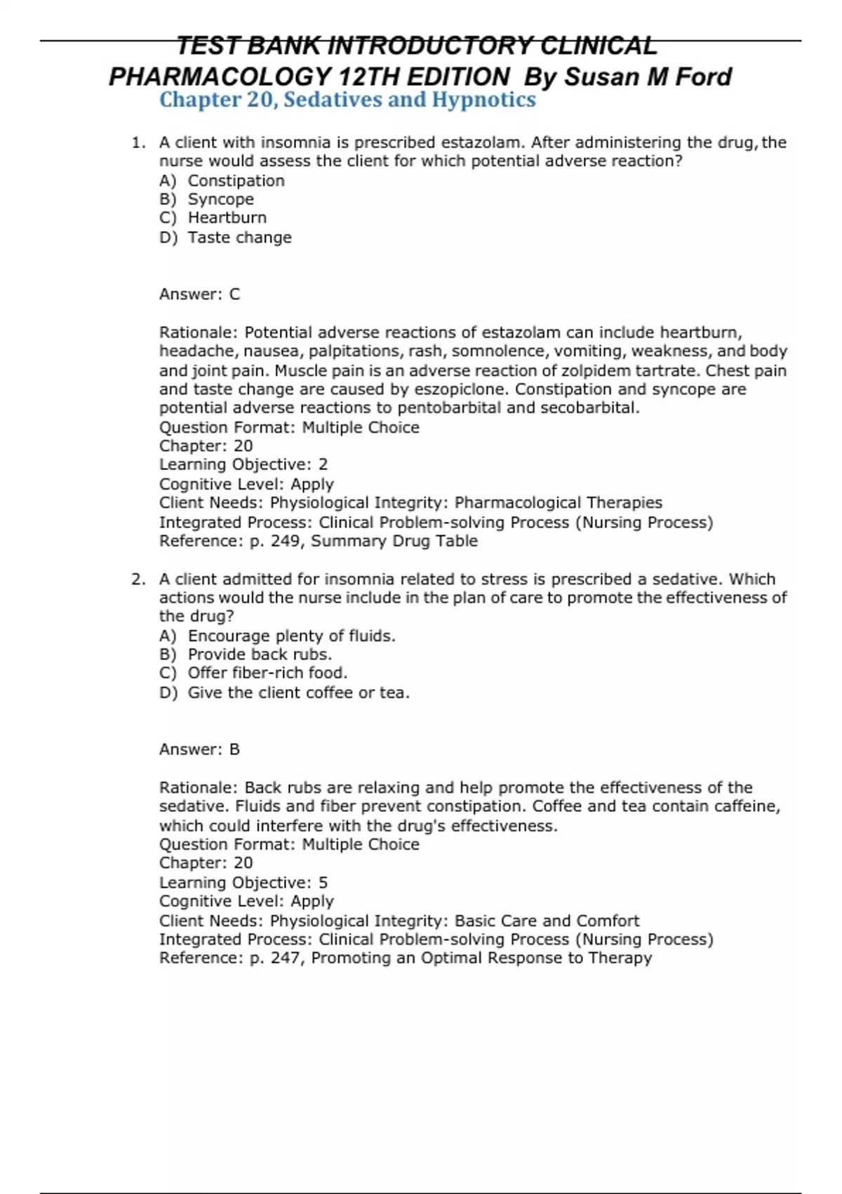 TEST BANK INTRODUCTORY CLINICAL PHARMACOLOGY 12TH EDITION By Susan M Ford 1. A client with insomnia is prescribed estazolam. After administering the drug,the nurse would assess the client for which potential adverse reaction? A) Constipation B) Syncope C) Heartburn D) Taste change Answer: C Rationale: Potential adverse reactions of estazolam can include heartburn, headache, nausea, palpitations, rash, somnolence, vomiting, weakness, and body and joint pain. Muscle pain is an adverse reaction of zolpidem tartrate. Chest pain and taste change are caused by eszopiclone. Constipation and syncope are potential adverse reactions to pentobarbital and secobarbital. Question Format: Multiple Choice Chapter: 20 Learning Objective: 2 Cognitive Level: Apply Client Needs: Physiological Integrity: Pharmacological Therapies Integrated Process: Clinical Problem-solving Process (Nursing Process) Reference: p. 249, Summary Drug Table 2. A client admitted for insomnia related to stress is prescribed a sedative. Which actions would the nurse include in the plan of care to promote the effectiveness of the drug? A) Encourage plenty of fluids. B) Provide back rubs. C) Offer fiber-rich food. D) Give the client coffee or tea. Answer: B Rationale: Back rubs are relaxing and help promote the effectiveness of the sedative. Fluids and fiber prevent constipation. Coffee and tea contain caffeine, which could interfere with the drug's effectiveness. Question Format: Multiple Choice Chapter: 20 Learning Objective: 5 Cognitive Level: Apply Client Needs: Physiological Integrity: Basic Care and Comfort Integrated Process: Clinical Problem-solving Process (Nursing Process) Reference: p. 247, Promoting an Optimal Response to Therapy TEST BANK INTRODUCTORY CLINICAL PHARMACOLOGY 12TH EDITION By Susan M Ford 3. A client is prescribed flurazepam. When explaining the drug to the client, the nurse would include which actions as its effect? A) Decreased stress B) Easing of pain C) Induction of sleep D) Improvement in circulation Answer: C Rationale: Flurazepam induces sleep. Adrenergic drugs help to relieve stress. Analgesics are used to ease pain. Circulation can be improved by exercising. Question Format: Multiple Choice Chapter: 20 Learning Objective: 2 Cognitive Level: Understand Client Needs: Physiological Integrity: Pharmacological Therapies Integrated Process: Teaching/Learning Reference: p. 243, Introduction 4. A nursing instructor is teaching a group of students about sedatives and hypnotics. The instructor determines the class is successful when the students correctly choose which situation as necessitating cautious administration? A) Lactation B) Heart trouble C) Hypertension D) Gastrointestinal upset
