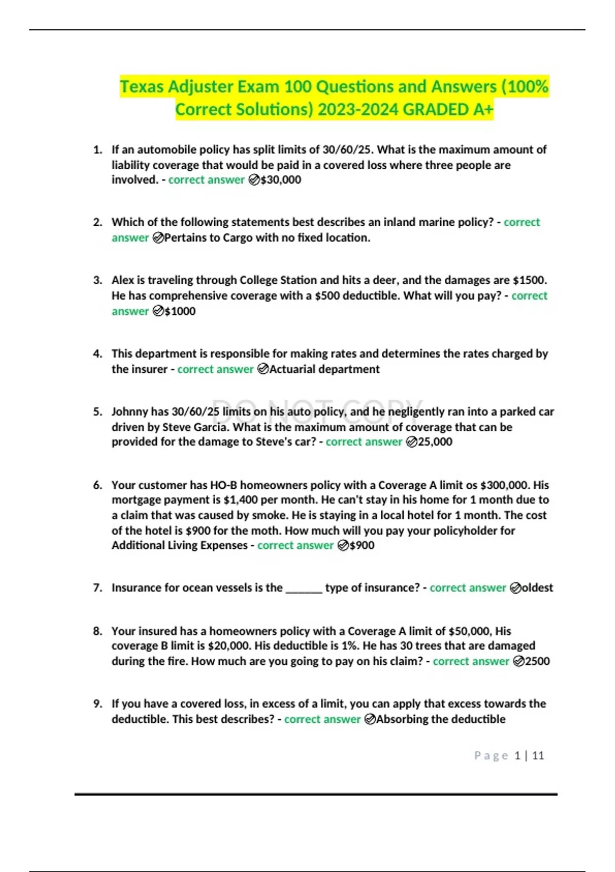 Texas Adjuster Exam 100 Questions and Answers (100% Correct Solutions) GRADED A+.Texas Adjuster Exam 100 Questions and Answers (100% Correct Solutions) GRADED A+.