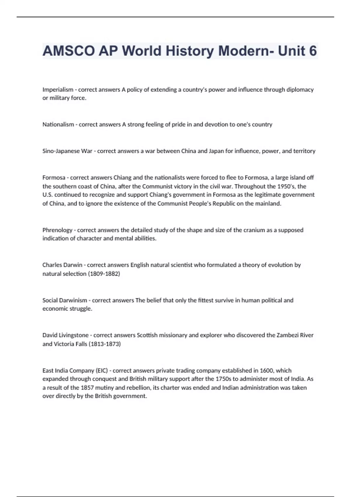 AMSCO AP World History Modern- Unit 6Imperialism - correct answers A policy of extending a country's power and influence through diplomacy or military force. Nationalism - correct answers A strong feeling of pride in and devotion to one's country Sino-Japanese War - correct answers a war between China and Japan for influence, power, and territory Formosa - correct answers Chiang and the nationalists were forced to flee to Formosa, a large island off the southern coast of China, after the Communist victory in the civil war. Throughout the 1950's, the U.S. continued to recognize and support Chiang's government in Formosa as the legitimate government of China, and to ignore the existence of the Communist People's Republic on the mainland. Phrenology - correct answers the detailed study of the shape and size of the cranium as a supposed indication of character and mental abilities. Charles Darwin - correct answers English natural scientist who formulated a theory of evolution by natural selection () Social Darwinism - correct answers The belief that only the fittest survive in human political and economic struggle. David Livingstone - correct answers Scottish missionary and explorer who discovered the Zambezi River and Victoria Falls () East India Company (EIC) - correct answers private trading company established in 1600, which expanded through conquest and British military support after the 1750s to administer most of India. As a result of the 1857 mutiny and rebellion, its charter was ended and Indian administration was taken over directly by the British government. Dutch East India Company (VOC) - correct answers A joint stock company chartered by the Dutch government to control all Dutch trade in the Indian and Pacific Oceans. Also known by its Dutch initials VOC for Verenigde Oostendische Compagnie. King Leopold II - correct answers King of Belgium (r. ). He was active in encouraging the exploration of Central Africa and became the infamous ruler of the Congo Free State (to 1908). Gold Coast - correct answers Region of the Atlantic coast of West Africa occupied by modern Ghana; named for its gold exports to Europe from the 1470s onward. Cape Colony - correct answers Dutch colony established at Cape of Good Hope in 1652 initially to provide a coastal station for the Dutch seaborne empire; by 1770 settlements had expanded sufficiently to come into conflict with Bantus. Congo Free State - correct answers a large area in Central Africa that was privately controlled by Leopold II of Belgium. He was able to secretly treat the people of the colony very badly until he was forced to give it up. Abyssinia - correct answers the ancient name for Ethiopia Liberia - correct answers In 1820, the American Colonization Society created a colony in West Africa for freed slaves to go. By the 1840s this colony had its own constitution and became and independent nation. Ceylon - correct answers an island in the Indian Ocean off the southeastern coast of India Dutch East Indies - correct answers A group of islands in South East Asia claimed by the Dutch during Imperialism. Indochina - correct answers a peninsula of southeastern Asia that includes Myanmar and Cambodia and Laos and Malaysia and Thailand and Vietnam