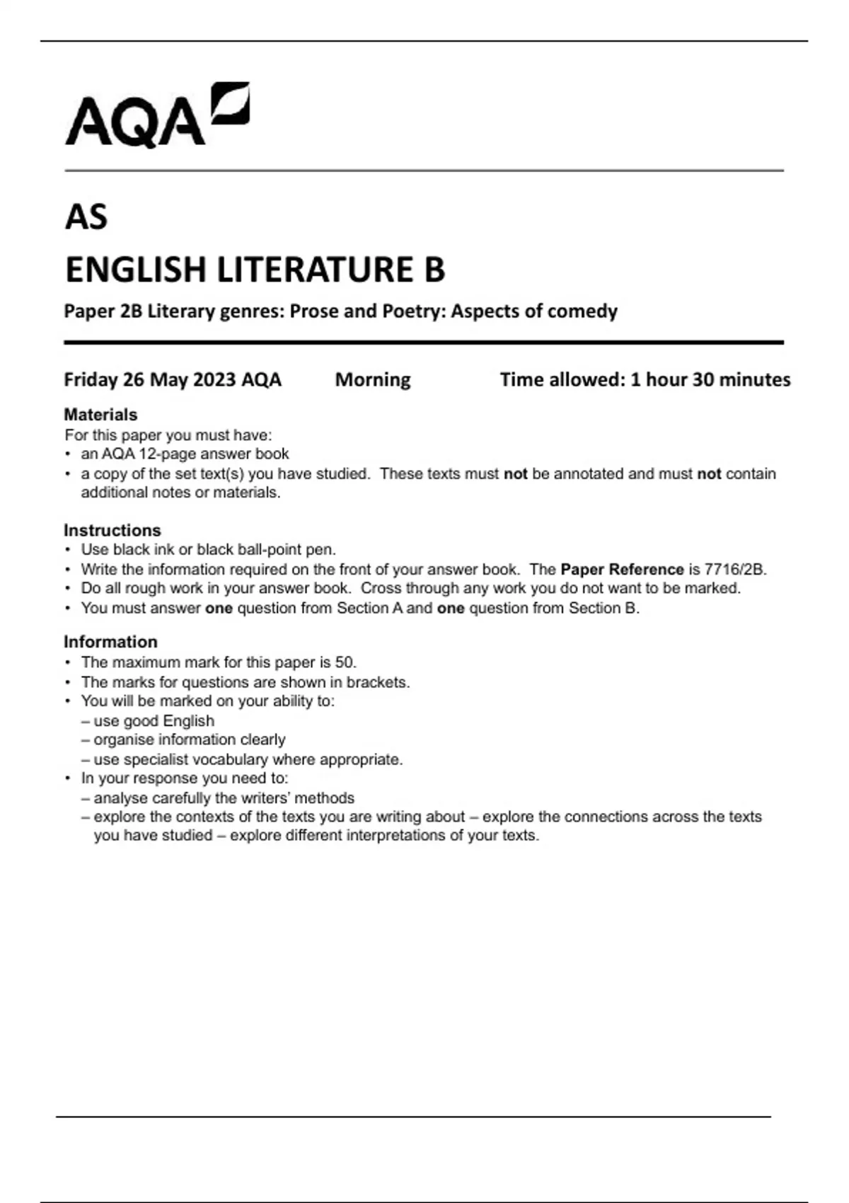 AQA AS ENGLISH LITERATURE B Paper 2B Literary genres: Prose and Poetry: Aspects of comedy 7716-2B-QP-EnglishLiteratureB-AS-26May23