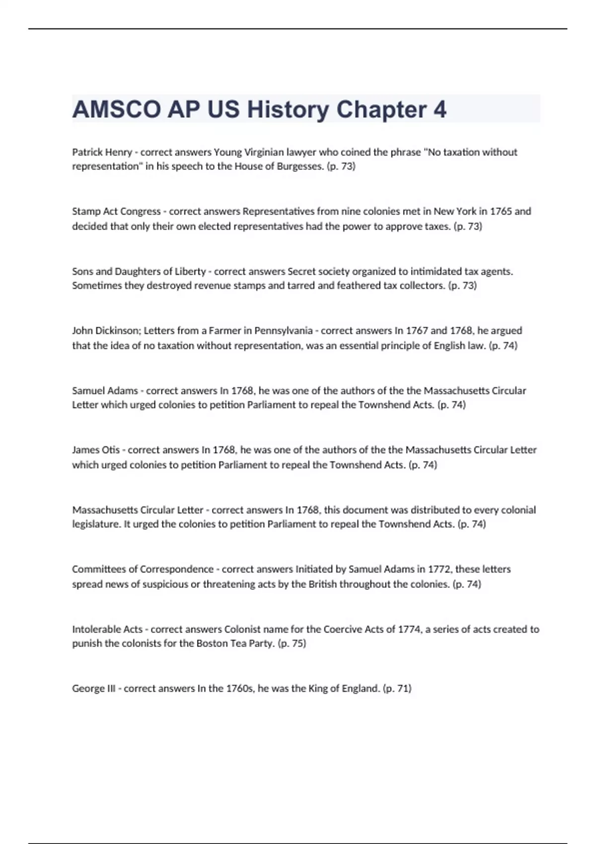 AMSCO AP US History Chapter 4Patrick Henry - correct answers Young Virginian lawyer who coined the phrase "No taxation without representation" in his speech to the House of Burgesses. (p. 73) Stamp Act Congress - correct answers Representatives from nine colonies met in New York in 1765 and decided that only their own elected representatives had the power to approve taxes. (p. 73) Sons and Daughters of Liberty - correct answers Secret society organized to intimidated tax agents. Sometimes they destroyed revenue stamps and tarred and feathered tax collectors. (p. 73) John Dickinson; Letters from a Farmer in Pennsylvania - correct answers In 1767 and 1768, he argued that the idea of no taxation without representation, was an essential principle of English law. (p. 74) Samuel Adams - correct answers In 1768, he was one of the authors of the the Massachusetts Circular Letter which urged colonies to petition Parliament to repeal the Townshend Acts. (p. 74) James Otis - correct answers In 1768, he was one of the authors of the the Massachusetts Circular Letter which urged colonies to petition Parliament to repeal the Townshend Acts. (p. 74) Massachusetts Circular Letter - correct answers In 1768, this document was distributed to every colonial legislature. It urged the colonies to petition Parliament to repeal the Townshend Acts. (p. 74) Committees of Correspondence - correct answers Initiated by Samuel Adams in 1772, these letters spread news of suspicious or threatening acts by the British throughout the colonies. (p. 74) Intolerable Acts - correct answers Colonist name for the Coercive Acts of 1774, a series of acts created to punish the colonists for the Boston Tea Party. (p. 75) George III - correct answers In the 1760s, he was the King of England. (p. 71) Whigs - correct answers In the 1760s, this was the dominant political party in Parliament that wanted the American colonies to bear more of the cost of maintaining the British empire. (p. 71) Parliament - correct answers The legislative house of Great Britain. (p. 71) salutary neglect - correct answers Great Britain had exercised little direct control over the colonies and did not enforce its navigation laws. This changed after the French and Indian War, as the British adopted more forceful policies for taking control of the colonies. (p. 71) Lord Frederick North - correct answers New prime minister of Britain who convinced Parliament to repeal the Townshend Acts in 1770. (p. 74) Pontiac's Rebellion - correct answers In 1763, American Indian chief Pontiac led a major attack against the colonial settlements on the western frontier. The British did not rely on colonial forces, but instead sent their army to deal with the rebellion. This led to the creation of the Proclamation of 1763. (p. 72) Proclamation Act of 1763 - correct answers This proclamation prohibited colonists from settling west of the Appalachian Mountains. The British hoped it would prevent violence between Native Americans and colonists. The colonists were angry and disobeyed the law, moving to the west of the imaginary boundary in large numbers. (p. 72) Seven Years' War (French and Indian War) - correct answers War fought in the colonies from 1754 to 1763 between the English and the French for possession of the Ohio River Valley area. The English won the war and the Peace of Paris was negotiated in 1763. (p. 70) Albany Plan of Union - correct answers The British government called for representatives from several colonies to meet in Albany, New York in 1754, to provide for an inter-colonial government to recruit troops and collect taxes. Each colony was too jealous of its own taxation powers to accept the plan. (p. 70) Edward Braddock - correct answers In 1755, this general led an army from colonial Virginia, to attack the French near Ft. Duquesne. More than 2,000 of his British and colonial troops were defeated by a smaller force of French and American Indians. (p. 70) George Washington - correct answers He led a small militia from the Virginia colony, to halt the completion of the French fort in the Ohio River Valley, Fort Duquesne. In July 1974, he was forced to surrender to a superior force of Frenchmen and their American Indian allies. This was the beginning of the French and Indian War. (p. 70) Peace of Paris - correct answers Peace treaty signed to end the French and Indian War (The Seven Years' War) in 1763. Great Britain gained French Canada and Spanish Florida. France gave Spain its western territory. (p. 71) Sugar Act - correct answers A 1764 British act which placed duties on foreign sugar and other luxuries. Its primary purpose was to raise money for the English Crown. (p. 72) Quartering ACT - correct answers This 1765 act required the colonists to provide food and living quarters for British soldiers. (p. 72) Stamp Act - correct answers This 1765 act required that revenue stamps be placed on almost all printed paper, such as legal documents, newspapers, and pamphlets. This was the first tax paid directly by the colonists, rather than merchants. Boycotts were effective in repealing this act. (p. 72) Declaratory Act - correct answers In 1766, Parliament declared that it had the right to tax and make laws for the colonies in all cases whatsoever. (p. 73) Townshend Acts - correct answers In 1767, Parliament enacted new taxes to be collected on imports of tea, glass, and paper. It also created the writs of assistance, which was a general license to search for smuggled goods anywhere. (p. 73) Writs of Assistance - correct answers A general license to search anywhere. (p. 73) Tea Act - correct answers In 1773, Parliament passed this act which taxed imported tea. The result was that British tea was even cheaper than smuggled Dutch tea. (p. 75) Coercive Acts - correct answers In 1774, after the Boston Tea Party, Great Britain created four Coercive Acts to punish the people of Boston and Massachusetts. (p. 75)
