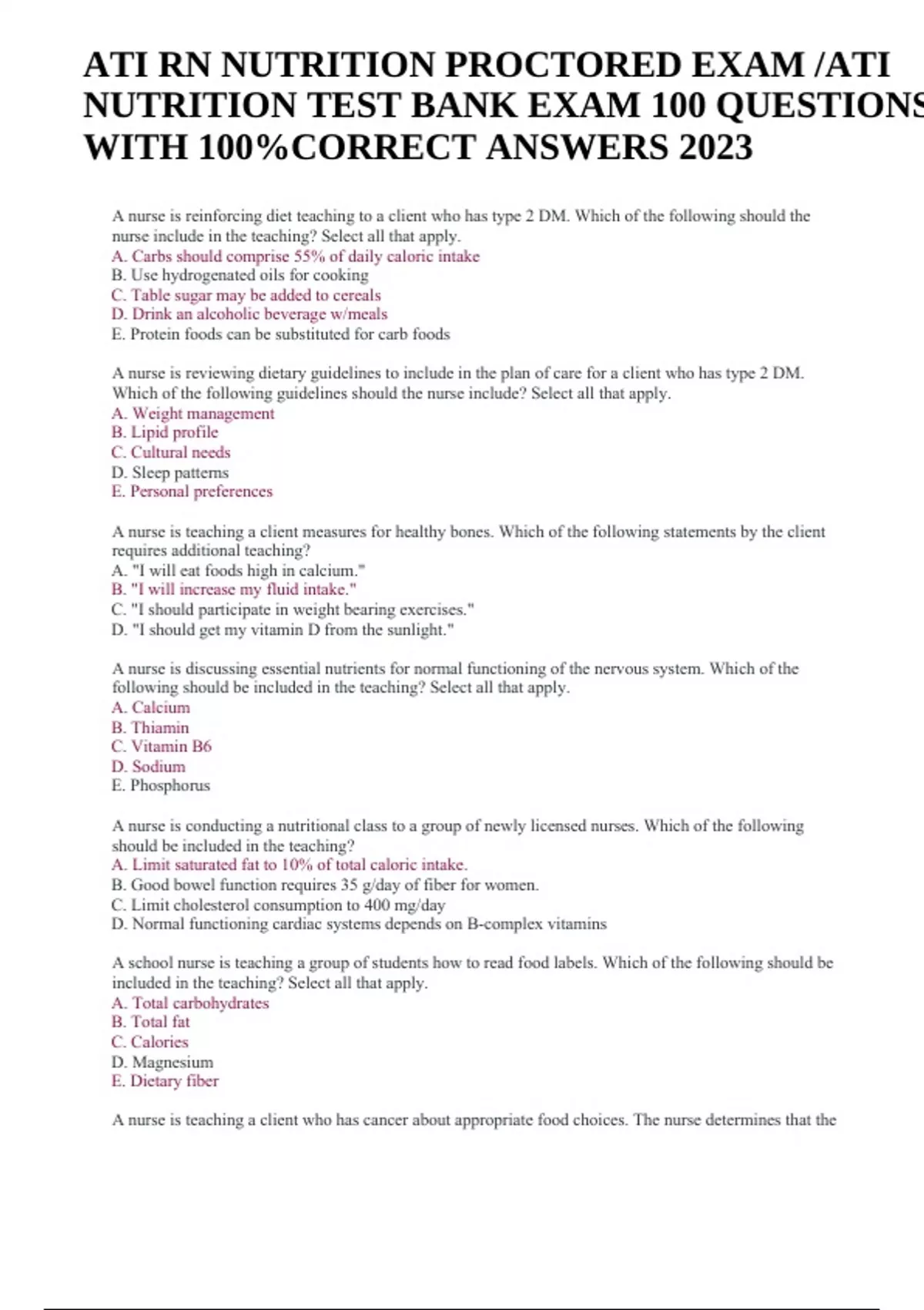 ATI RN NUTRITION PROCTORED EXAM /ATI NUTRITION TEST BANK EXAM 100 QUESTIONS WITH 100%CORRECT ANSWERS 2023. A nurse is reinforcing diet teaching to a client who has type 2 DM. Which of the following should the nurse include in the teaching? Select all that apply. A. Carbs should comprise 55% of daily caloric intake B. Use hydrogenated oils for cooking C. Table sugar may be added to cereals D. Drink an alcoholic beverage w/meals E. Protein foods can be substituted for carb foods A nurse is reviewing dietary guidelines to include in the plan of care for a client who has type 2 DM. Which of the following guidelines should the nurse include? Select all that apply. A. Weight management B. Lipid profile C. Cultural needs D. Sleep patterns E. Personal preferences A nurse is teaching a client measures for healthy bones. Which of the following statements by the client requires additional teaching? A. "I will eat foods high in calcium." B. "I will increase my fluid intake." C. "I should participate in weight bearing exercises." D. "I should get my vitamin D from the sunlight." A nurse is discussing essential nutrients for normal functioning of the nervous system. Which of the following should be included in the teaching? Select all that apply. A. Calcium B. Thiamin C. Vitamin B6 D. Sodium E. Phosphorus A nurse is conducting a nutritional class to a group of newly licensed nurses. Which of the following should be included in the teaching? A. Limit saturated fat to 10% of total caloric intake. B. Good bowel function requires 35 g/day of fiber for women. C. Limit cholesterol consumption to 400 mg/day D. Normal functioning cardiac systems depends on B-complex vitamins A school nurse is teaching a group of students how to read food labels. Which of the following should be included in the teaching? Select all that apply. A. Total carbohydrates B. Total fat C. Calories D. Magnesium E. Dietary fiber A nurse is teaching a client who has cancer about appropriate food choices. The nurse determines that the ATI RN NUTRITION PROCTORED EXAM /ATI NUTRITION TEST BANK EXAM 100 QUESTIONS WITH 100%CORRECT ANSWERS 2023 client understands the information when she chooses which of the following snacks? Select all that apply. A. Peanut butter sandwich on whole wheat bread w/2% milk B. Popcorn w/soda C. Yogurt topped w/granola & a banana D. Meat lasagna w/buttered garlic bread E. Plain baked potato Which of the following food choices is appropriate for a pt. with GERD? Select all that apply. A. Baked salmon B. Skim milk C. Orange juice D. Decaffeinated tea E. Eggs and salsa For which disease/condition would the nurse teach the client about a gluten-free diet? A. A 54 year old man with pancreatitis. B. A 32 year old woman with celiac disease. C. A 22 year old man with diverticulitis. D. A 76 year old woman with breast cancer. A nurse is providing instructions to a client who has a new diagnosis of celiac disease. Which of the following food choices by the client indicates a need for further teaching? A. Potatoes B. Graham crackers C. Wild rice D. Canned pears A nurse is providing instructions to a client who reports constipation & has a prescription for a high-fiber, low-fat diet. Which of the following food choices by the client indicates understanding of the teaching? A. Peanut butter B. Peeled apples C. Hardboiled egg D. Brown rice A nurse is caring for a client post appy. The nurse verifies the postop prescription, which reads "discontinue NPO status; advance diet as tolerated." Which of the following are appropriate for the nurse to offer the client? Select all that apply. A. Applesauce B. Chicken broth C. Sherbet D. Wheat toast E. Cranberry juice A nurse is caring for a client who is on a full liquid diet due to dysphagia. Which of the following nursing actions is the highest priority? A. Add thickener to liquids. B. Educate the client about acceptable liquids. C. Perform a calorie count of consumed liquids. D. Offer high-protein liquid supplements. A nurse is performing dietary needs assessments for a group of clients. A blenderized liquid diet is appropriate for which of the following clients? Select all that apply. A. A client who has a wired jaw due to an MVA B. A client who is 24 hr postop following temporomandibular joint repair C. A client who has difficulty chewing due to a traumatic brain injury D. A client who has hypercholesterolemia due to CAD E. A client who is scheduled for a colonoscopy the next morning A nurse is assessing a client who is postop following a colon resection. Which of the following findings indicates that the client is ready to transition from NPO to oral intake? A. Client report of hunger B. Urinary output exceeding 30 mL/hr C. Decrease in incisional pain D. Passage of flatus A nurse is assisting a client who has a prescription for a mechanical soft diet w/food selections. Which of the following are appropriate selections by the client? Select all that apply. A. Dried prunes B. Ground turkey C. Mashed carrots D. Fresh strawberries E. Cottage cheese.