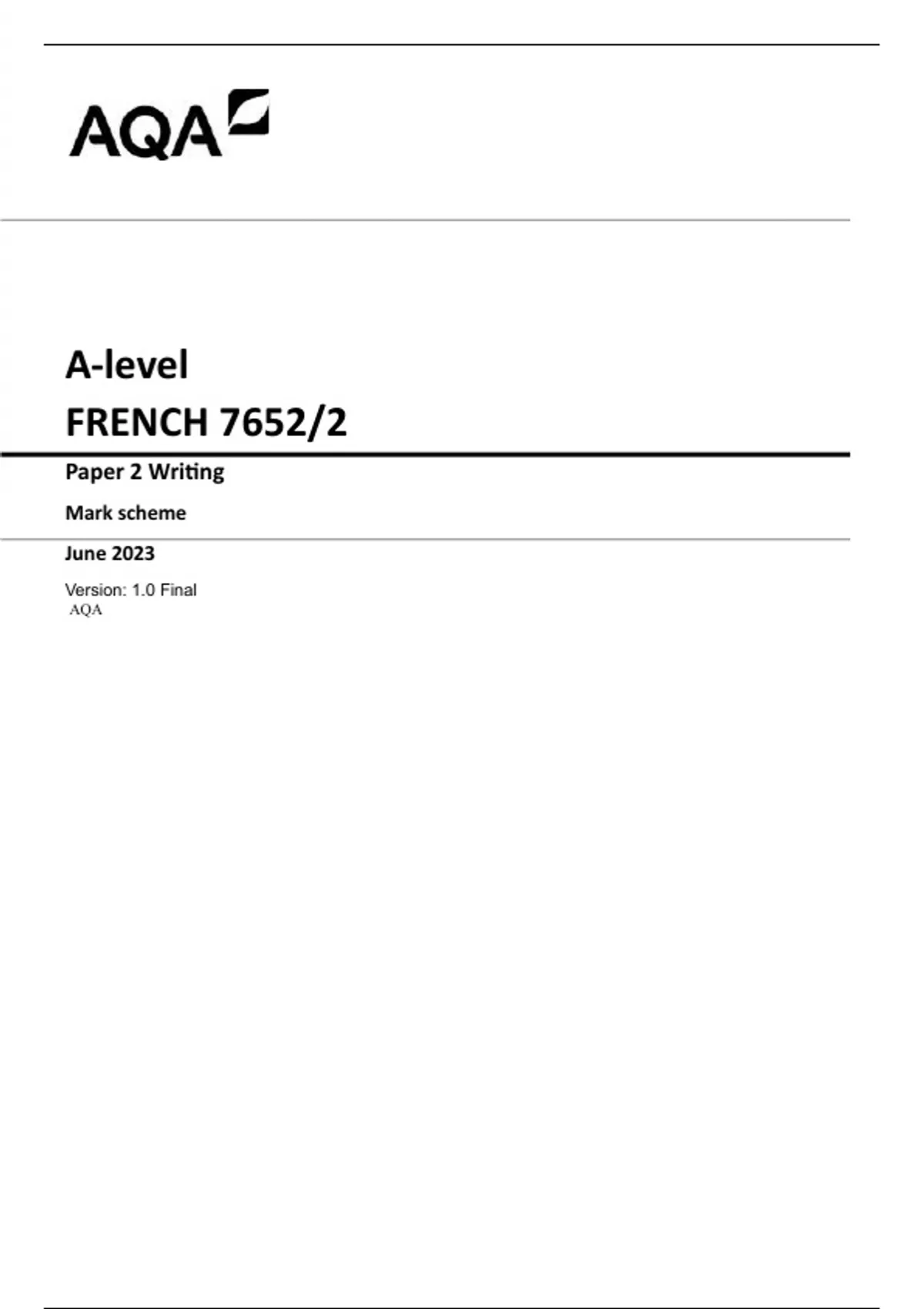 AQA A-level FRENCH 7652/2 Paper 2 Writing Mark scheme June 2023 Version: 1.0 Final