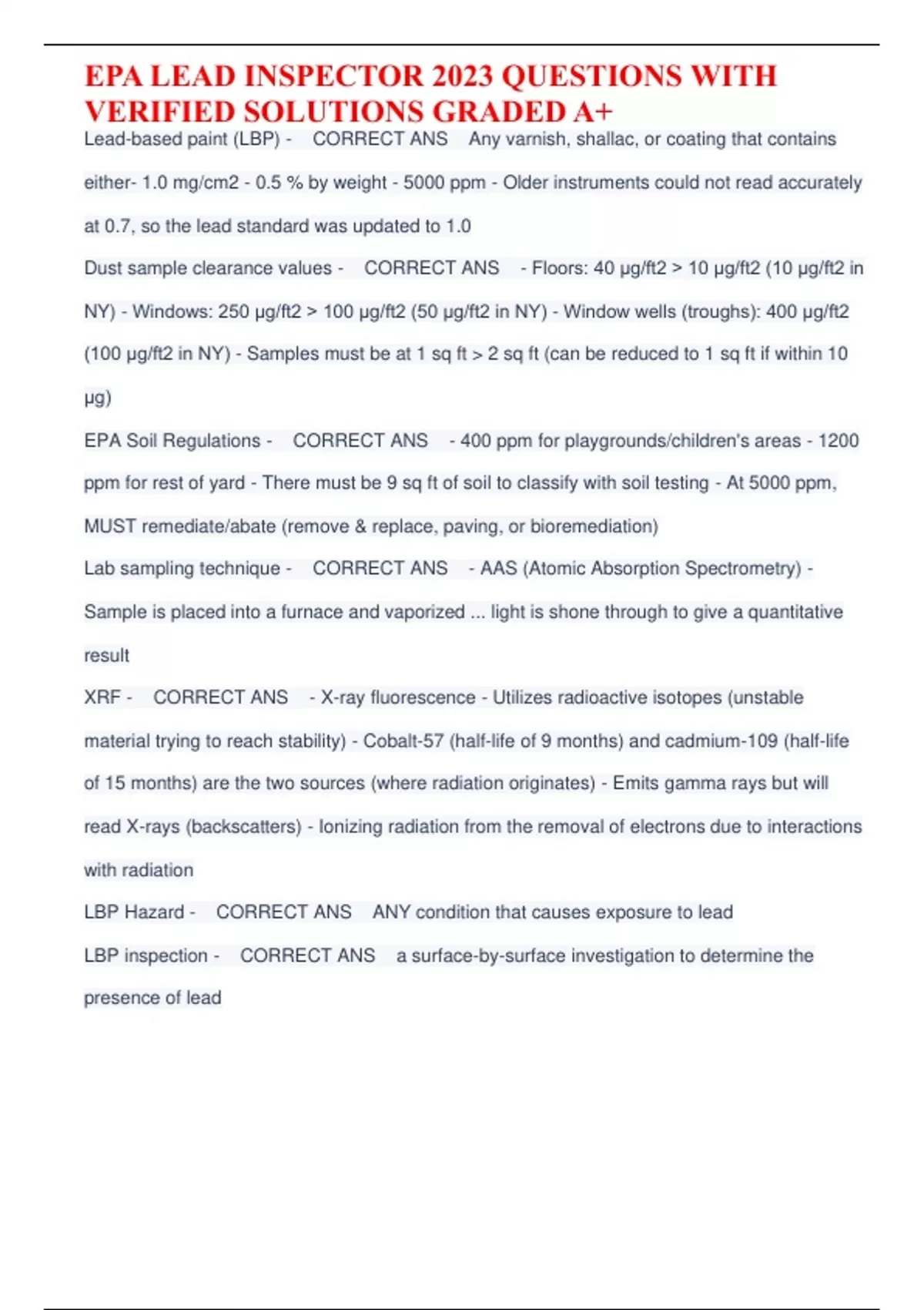 Lead-based paint (LBP) - CORRECT ANS Any varnish, shallac, or coating that contains either- 1.0 mg/cm2 - 0.5 % by weight - 5000 ppm - Older instruments could not read accurately at 0.7, so the lead standard was updated to 1.0 Dust sample clearance values - CORRECT ANS - Floors: 40 μg/ft2 10 μg/ft2 (10 μg/ft2 in NY) - Windows: 250 μg/ft2 100 μg/ft2 (50 μg/ft2 in NY) - Window wells (troughs): 400 μg/ft2 (100 μg/ft2 in NY) - Samples must be at 1 sq ft 2 sq ft (can be reduced to 1 sq ft if within 10 μg) EPA Soil Regulations - CORRECT ANS - 400 ppm for playgrounds/children's areas - 1200 ppm for rest of yard - There must be 9 sq ft of soil to classify with soil testing - At 5000 ppm, MUST remediate/abate (remove & replace, paving, or bioremediation) Lab sampling technique - CORRECT ANS - AAS (Atomic Absorption Spectrometry) - Sample is placed into a furnace and vaporized ... light is shone through to give a quantitative result XRF - CORRECT ANS - X-ray fluorescence - Utilizes radioactive isotopes (unstable material trying to reach stability) - Cobalt-57 (half-life of 9 months) and cadmium-109 (half-life of 15 months) are the two sources (where radiation originates) - Emits gamma rays but will read X-rays (backscatters) - Ionizing radiation from the removal of electrons due to interactions with radiation LBP Hazard - CORRECT ANS ANY condition that causes exposure to lead LBP inspection - CORRECT ANS a surface-by-surface investigation to determine the presence of lead CPSC - CORRECT ANS - Consumer Product Safety Commission - Set a lead paint standard: cannot contain 0.06% lead by weight ... updated to 0.009% - The commission banned lead-based paint in 1978 True/False: Dust sampling only done for hazard assessments - CORRECT ANS True; only risk assessors take samples to determine likelihood of coming into contact with contaminants What kind of sampling must be done for inspections? - CORRECT ANS Random ... repeats must be annotated then you move onto the next HUD Guidelines for abatement - CORRECT ANS Must last 20 years. Includes the following procedures: - Removal - Enclosure - Replacement - Encapsulation Painting over is a temporary fix! Water standards for lead - CORRECT ANS - 15 ppb under the Clean Water Act (CWA) - 5 ppb under the FDA standard (bottled water) *These are the ONLY instances where ppb is used Why was lead used so much? - CORRECT ANS - Durable - Colorful - Anti-corrosive - Anti-fungal - Drying agent What does RRP do? - CORRECT ANS - Renovation, Repairing, and Painting program - Provided enforcement to Title X in 2010 ... $37,500 fines for violation - Dust sampling technicians can only sample for RRP projects What must you do if a pre-1978 site is not tested? - CORRECT ANS Presume lead-based paint. Where is LBP still allowed? - CORRECT ANS C