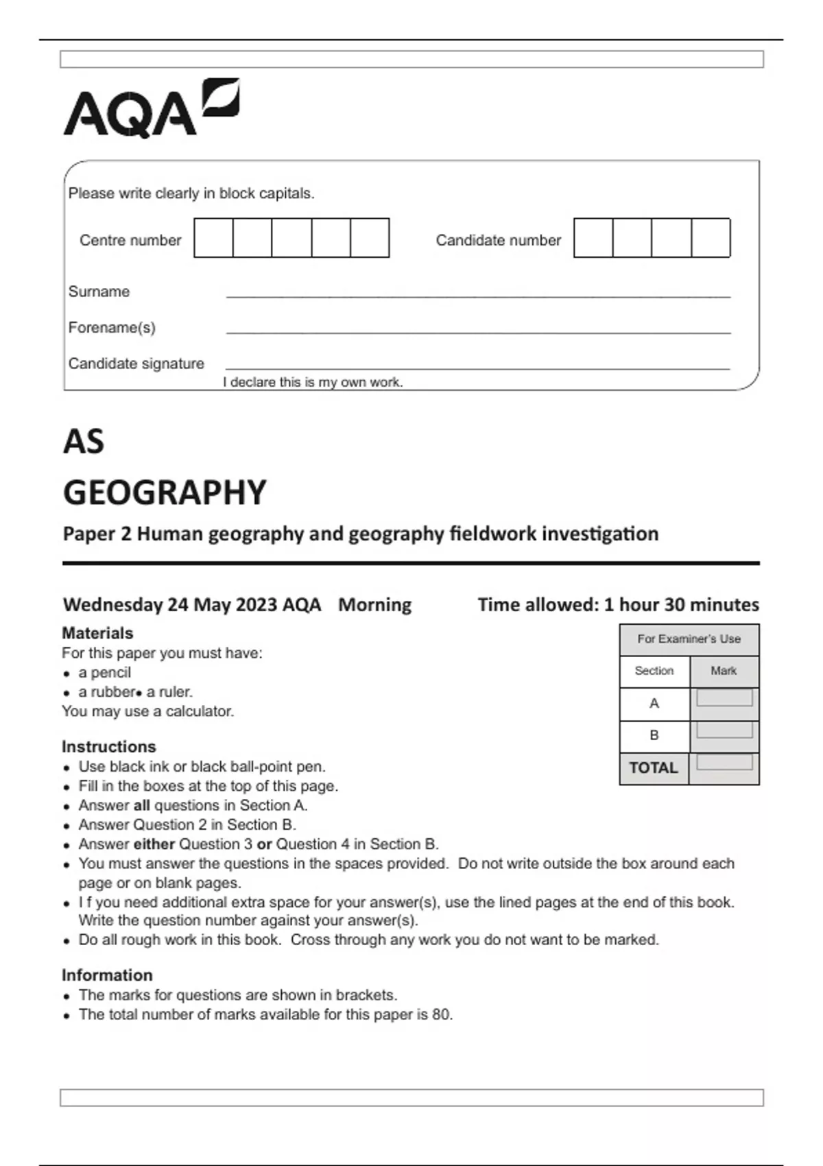 AQA AS GEOGRAPHY Paper 2 Human geography and geography fieldwork investigation 7036-2-QP-Geography-AS-24May23