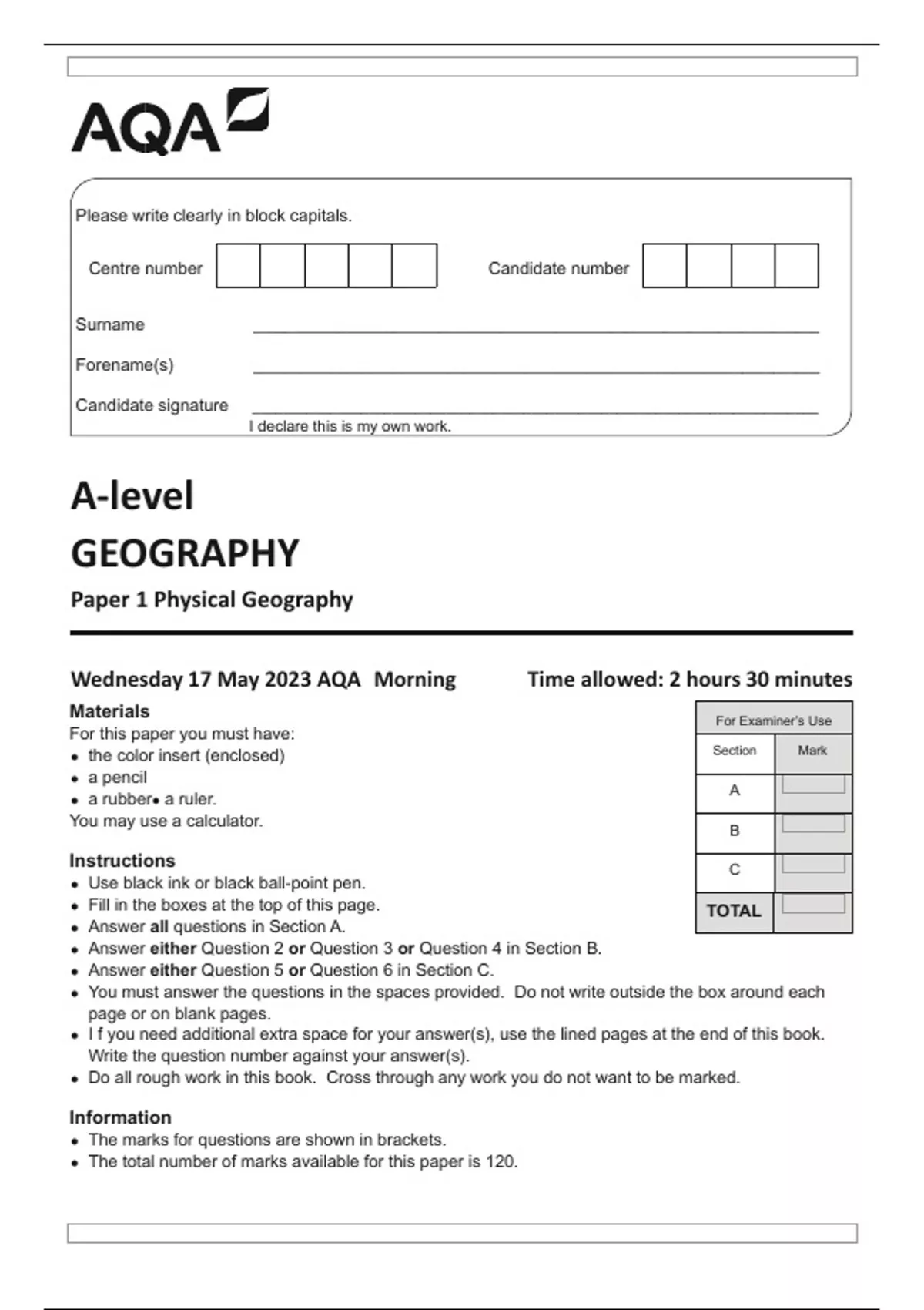 AQA A-level GEOGRAPHY Paper 1 Physical Geography 7037-1-QP-Geography-A-17May23