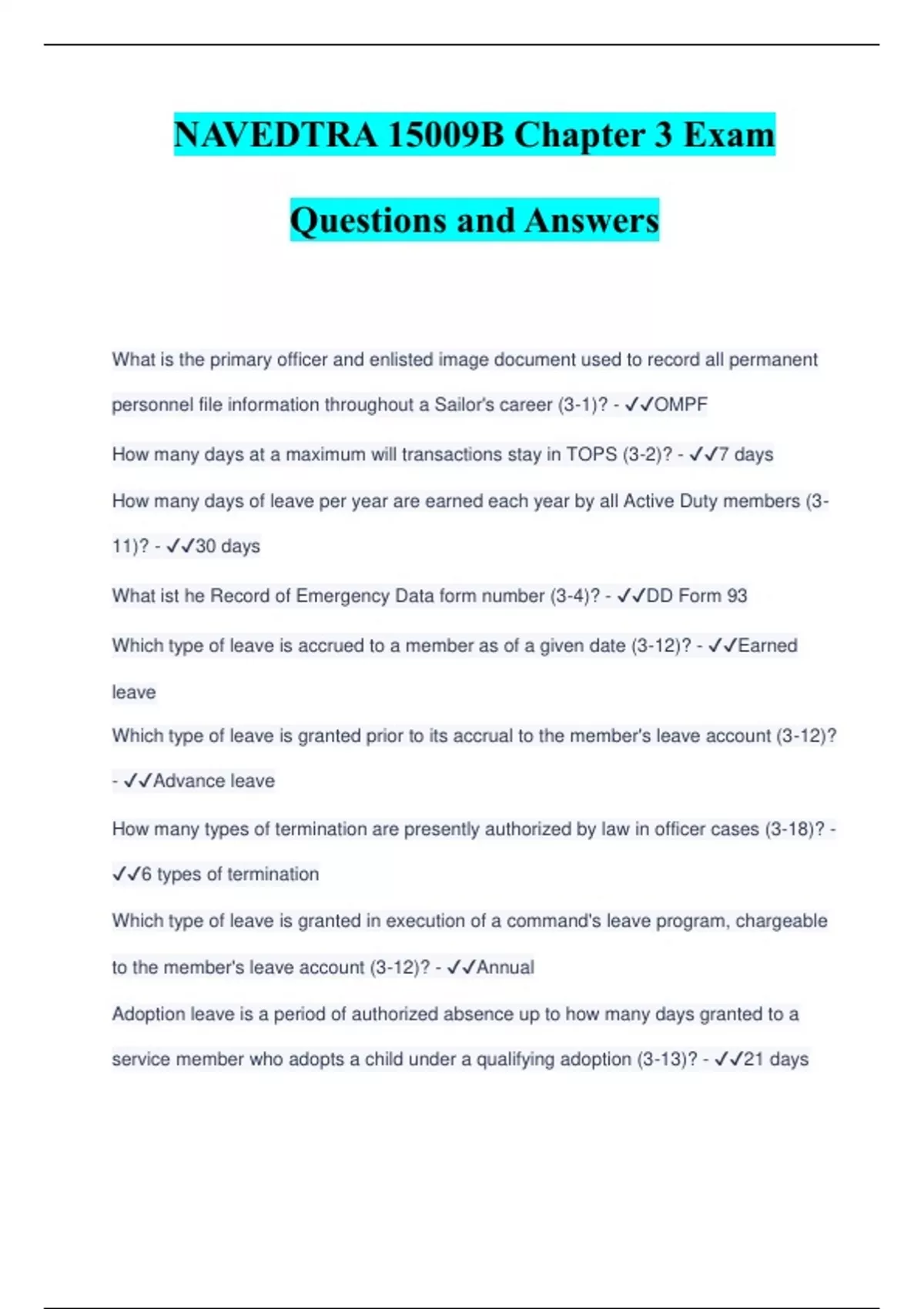 NAVEDTRA 15009B Chapter 3 Exam Questions and Answers What is the primary officer and enlisted image document used to record all permanent personnel file information throughout a Sailor's career (3-1)? - ️️ OMPF How many days at a maximum will transactions stay in TOPS (3-2)? - ️️ 7 days How many days of leave per year are earned each year by all Active Duty members (3- 11)? - ️️ 30 days What ist he Record of Emergency Data form number (3-4)? - ️️ DD Form 93 Which type of leave is accrued to a member as of a given date (3-12)? - ️️ Earned leave Which type of leave is granted prior to its accrual to the member's leave account (3-12)? - ️️ Advance leave How many types of termination are presently authorized by law in officer cases (3-18)? - ️️ 6 types of termination Which type of leave is granted in execution of a command's leave program, chargeable to the member's leave account (3-12)? - ️️ Annual Adoption leave is a period of authorized absence up to how many days granted to a service member who adopts a child under a qualifying adoption (3-13)? - ️️ 21 days