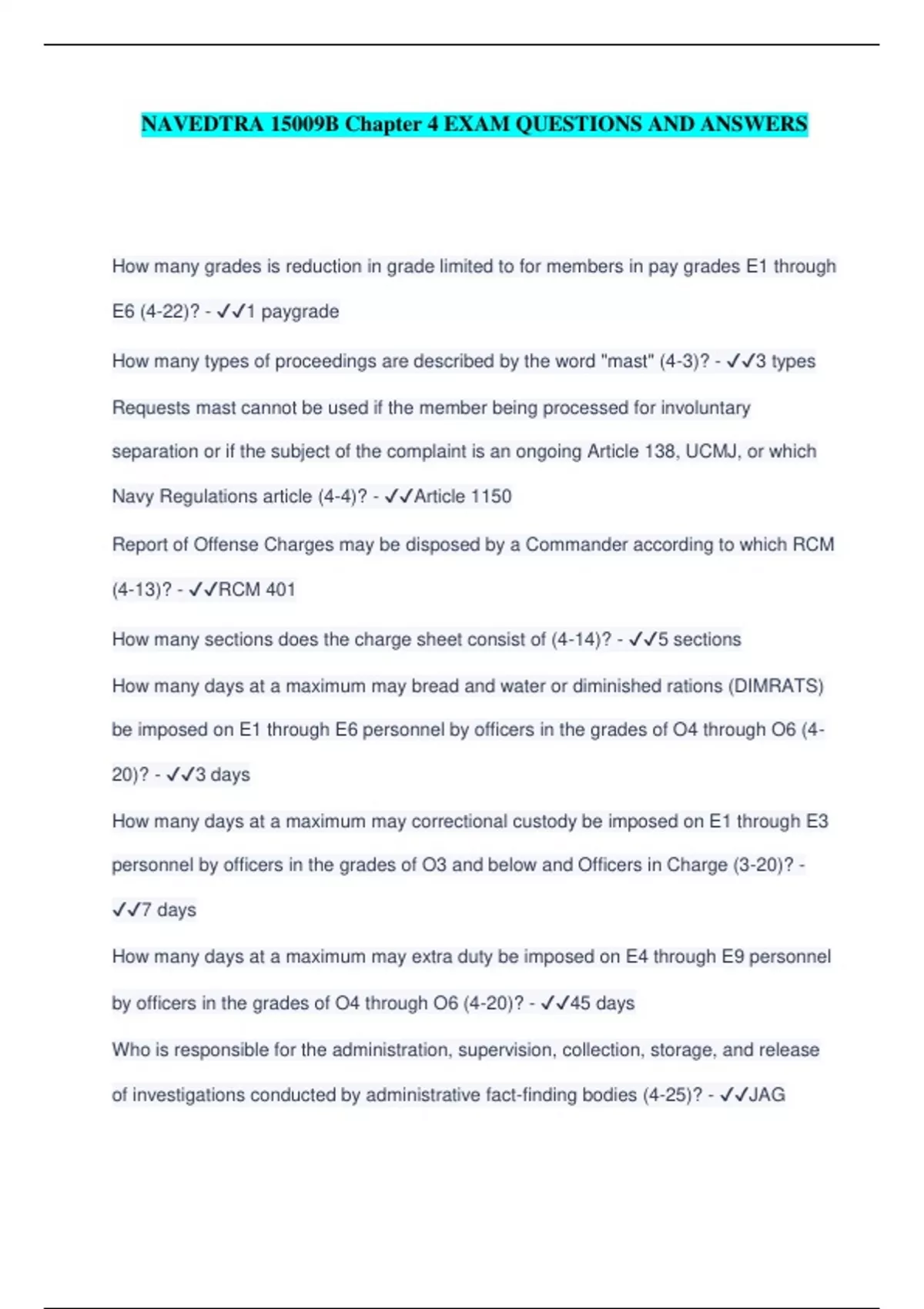 NAVEDTRA 15009B Chapter 4 EXAM QUESTIONS AND ANSWERS How many grades is reduction in grade limited to for members in pay grades E1 through E6 (4-22)? - ️️ 1 paygrade How many types of proceedings are described by the word "mast" (4-3)? - ️️ 3 types Requests mast cannot be used if the member being processed for involuntary separation or if the subject of the complaint is an ongoing Article 138, UCMJ, or which Navy Regulations article (4-4)? - ️️ Article 1150 Report of Offense Charges may be disposed by a Commander according to which RCM (4-13)? - ️️ RCM 401 How many sections does the charge sheet consist of (4-14)? - ️️ 5 sections How many days at a maximum may bread and water or diminished rations (DIMRATS) be imposed on E1 through E6 personnel by officers in the grades of O4 through O6 (4- 20)? - ️️ 3 days How many days at a maximum may correctional custody be imposed on E1 through E3 personnel by officers in the grades of O3 and below and Officers in Charge (3-20)? - ️️ 7 days How many days at a maximum may extra duty be imposed on E4 through E9 personnel by officers in the grades of O4 through O6 (4-20)? - ️️ 45 days Who is responsible for the administration, supervision, collection, storage, and release of investigations conducted by administrative fact-finding bodies (4-25)? - ️️ JAG