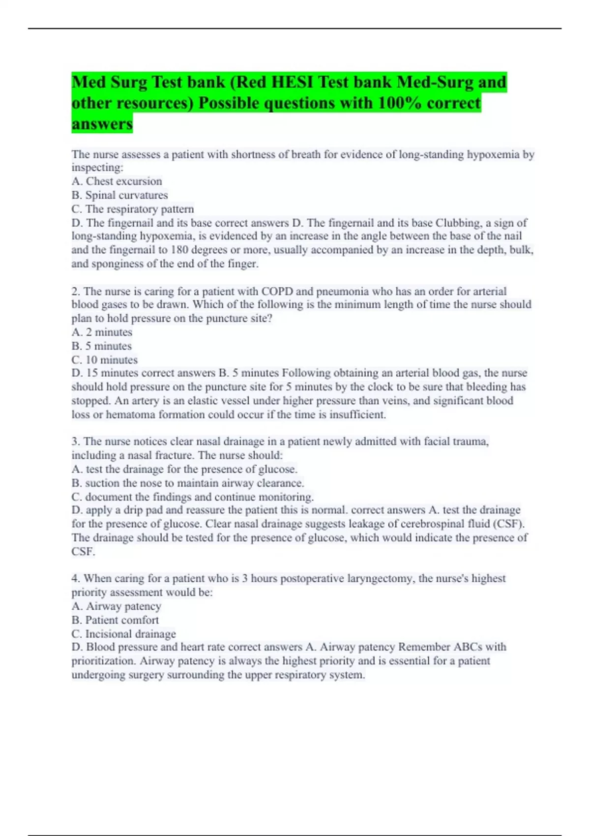 The nurse assesses a patient with shortness of breath for evidence of long-standing hypoxemia by inspecting: A. Chest excursion B. Spinal curvatures C. The respiratory pattern D. The fingernail and its base correct answers D. The fingernail and its base Clubbing, a sign of long-standing hypoxemia, is evidenced by an increase in the angle between the base of the nail and the fingernail to 180 degrees or more, usually accompanied by an increase in the depth, bulk, and sponginess of the end of the finger. 2. The nurse is caring for a patient with COPD and pneumonia who has an order for arterial blood gases to be drawn. Which of the following is the minimum length of time the nurse should plan to hold pressure on the puncture site? A. 2 minutes B. 5 minutes C. 10 minutes D. 15 minutes correct answers B. 5 minutes Following obtaining an arterial blood gas, the nurse should hold pressure on the puncture site for 5 minutes by the clock to be sure that bleeding has stopped. An artery is an elastic vessel under higher pressure than veins, and significant blood loss or hematoma formation could occur if the time is insufficient. 3. The nurse notices clear nasal drainage in a patient newly admitted with facial trauma, including a nasal fracture. The nurse should: A. test the drainage for the presence of glucose. B. suction the nose to maintain airway clearance. C. document the findings and continue monitoring. D. apply a drip pad and reassure the patient this is normal. correct answers A. test the drainage for the presence of glucose. Clear nasal drainage suggests leakage of cerebrospinal fluid (CSF). The drainage should be tested for the presence of glucose, which would indicate the presence of CSF. 4. When caring for a patient who is 3 hours postoperative laryngectomy, the nurse's highest priority assessment would be: A. Airway patency B. Patient comfort C. Incisional drainage D. Blood pressure and heart rate correct answers A. Airway patency Remember ABCs with prioritization. Airway patency is always the highest priority and is essential for a patient undergoing surgery surrounding the upper respiratory system.