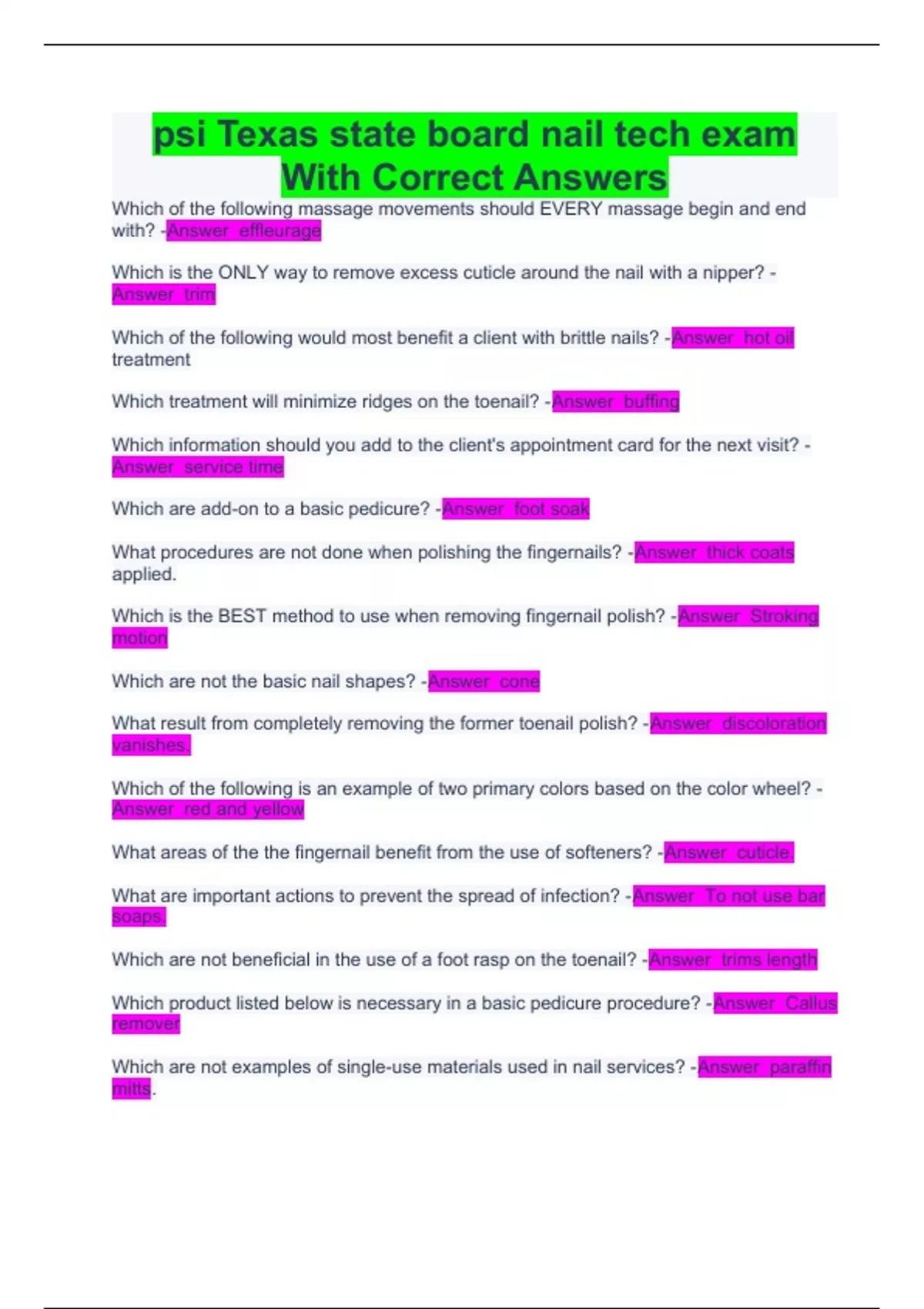 psi Texas state board nail tech exam With Correct Answers