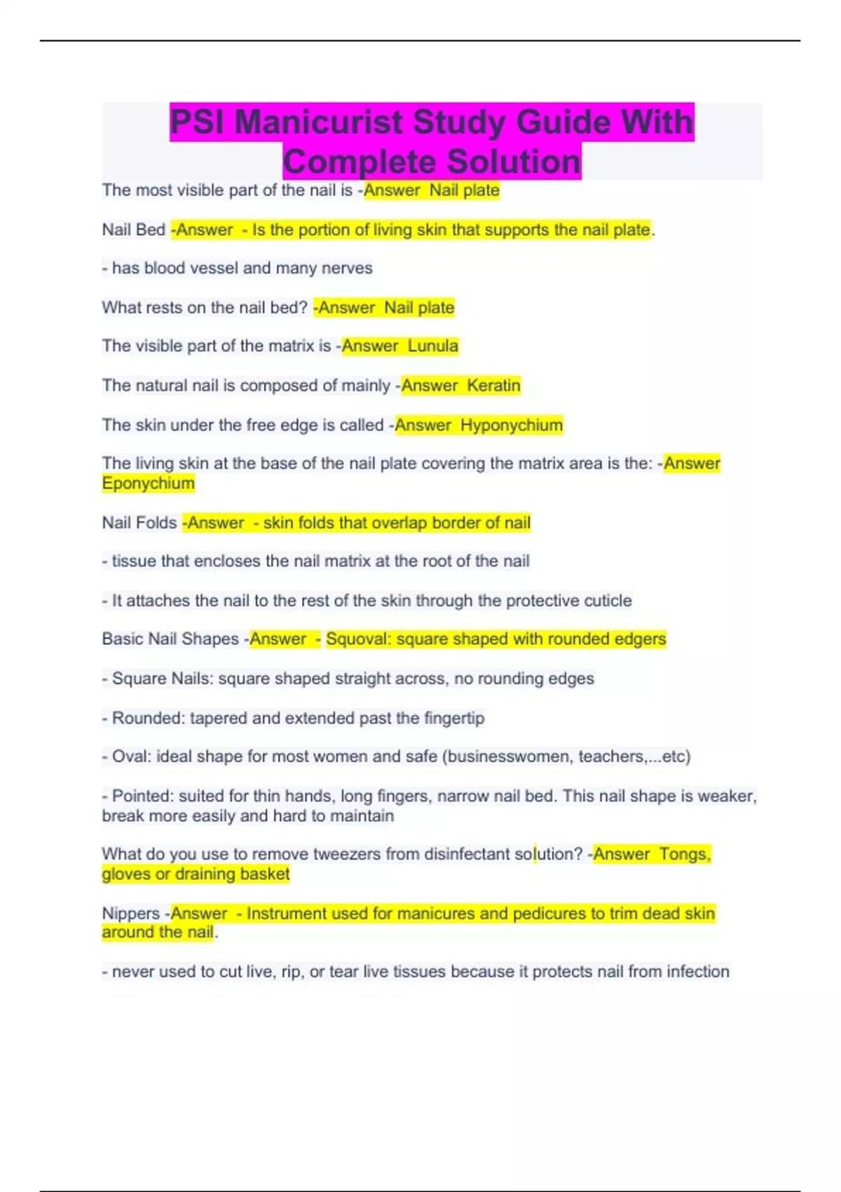 PSI Manicurist Study Guide With Complete Solution