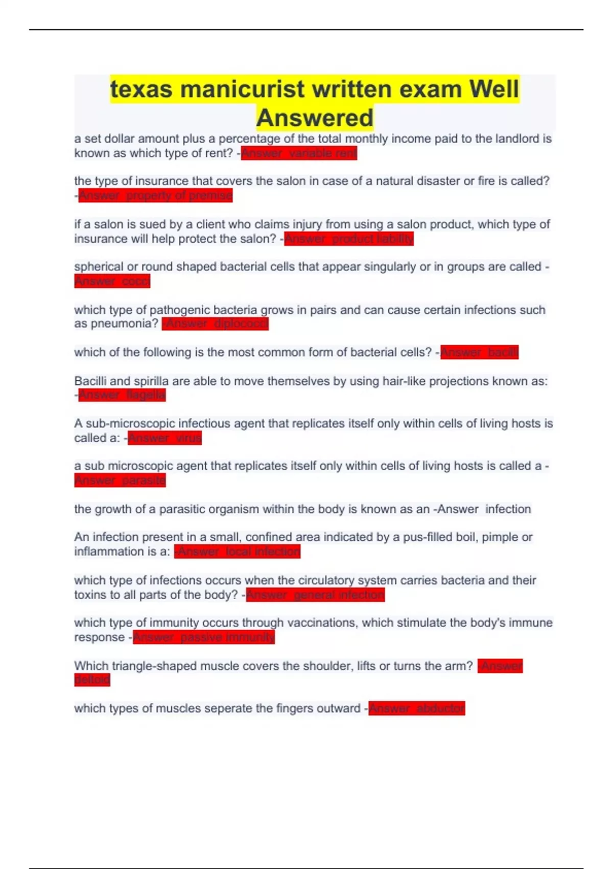 a set dollar amount plus a percentage of the total monthly income paid to the landlord is known as which type of rent? -Answer variable rent the type of insurance that covers the salon in case of a natural disaster or fire is called? -Answer property of premise if a salon is sued by a client who claims injury from using a salon product, which type of insurance will help protect the salon? -Answer product liability spherical or round shaped bacterial cells that appear singularly or in groups are called -Answer cocci which type of pathogenic bacteria grows in pairs and can cause certain infections such as pneumonia? -Answer diplococci which of the following is the most common form of bacterial cells? -Answer bacilli Bacilli and spirilla are able to move themselves by using hair-like projections known as: -Answer flagella A sub-microscopic infectious agent that replicates itself only within cells of living hosts is called a: -Answer virus a sub microscopic agent that replicates itself only within cells of living hosts is called a -Answer parasite the growth of a parasitic organism within the body is known as an -Answer infection An infection present in a small, confined area indicated by a pus-filled boil, pimple or inflammation is a: -Answer local infection which type of infections occurs when the circulatory system carries bacteria and their toxins to all parts of the body? -Answer general infection which type of immunity occurs through vaccinations, which stimulate the body's immune response -Answer passive immunity Which triangle-shaped muscle covers the shoulder, lifts or turns the arm? -Answer deltoid which types of muscles seperate the fingers outward -Answer abductor
