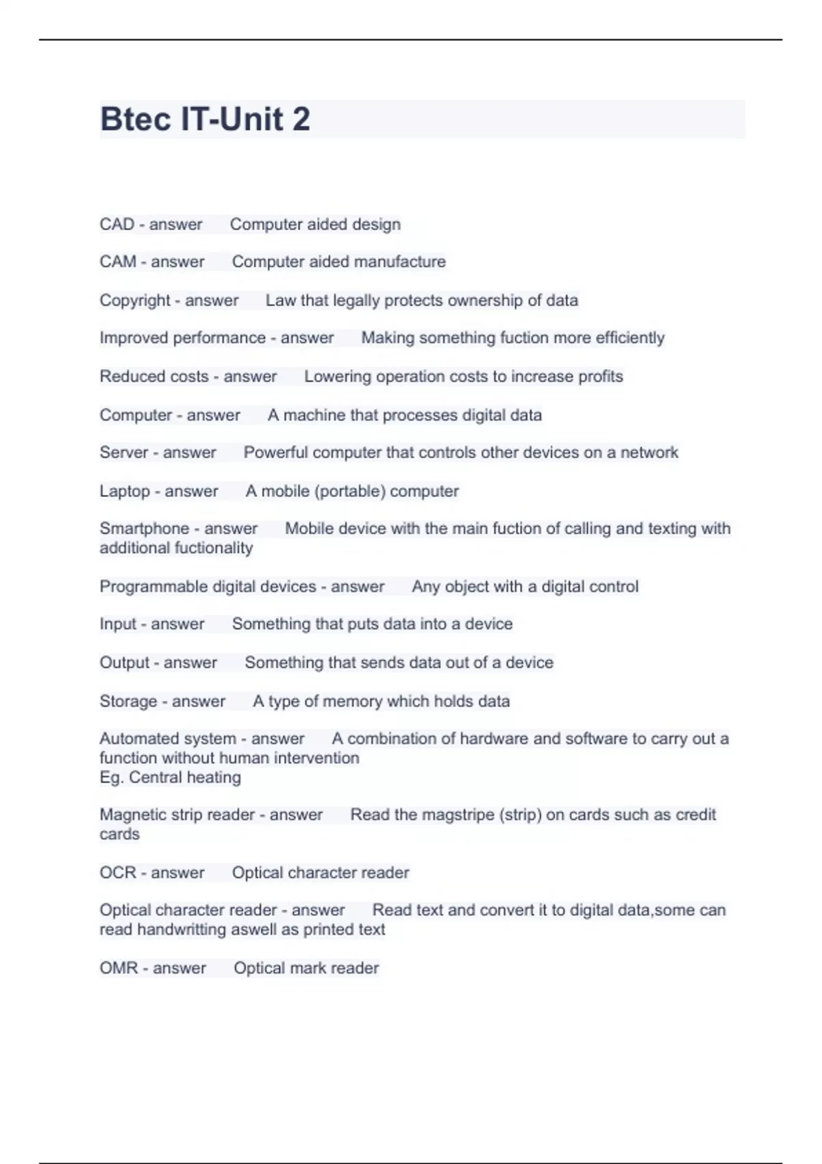 Btec IT-Unit 2 Questions with Accurate Answers 2023