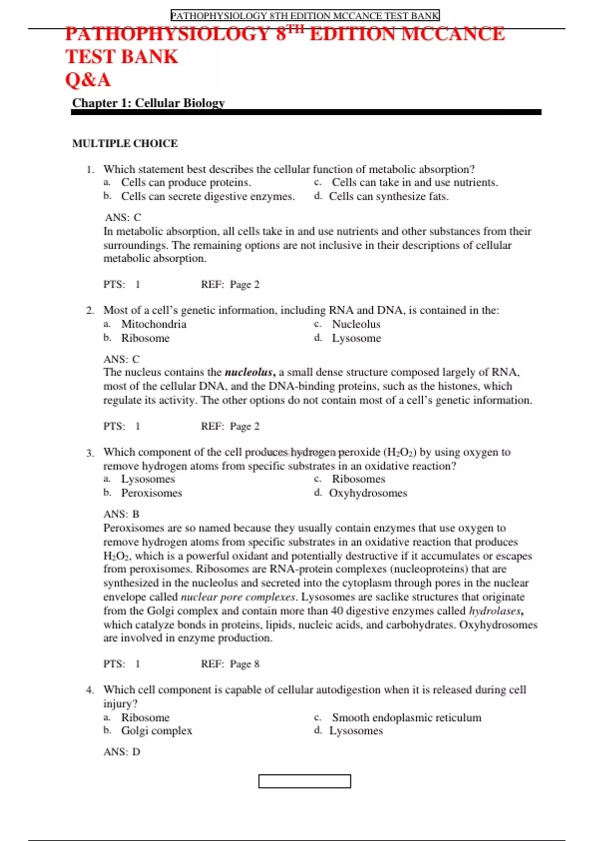 PATHOPHYSIOLOGY 8TH EDITION MCCANCE TEST BANK Q&A Which statement best describes the cellular function of metabolic absorption?