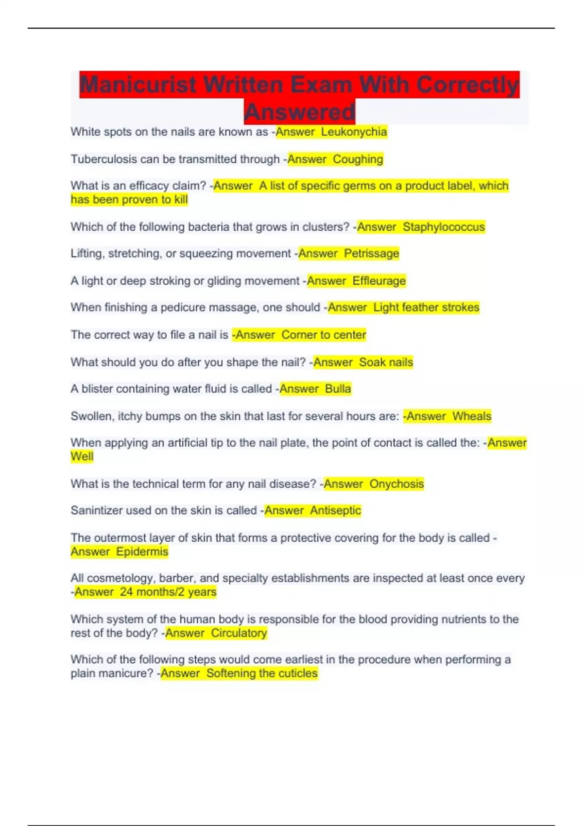 White spots on the nails are known as -Answer Leukonychia Tuberculosis can be transmitted through -Answer Coughing What is an efficacy claim? -Answer A list of specific germs on a product label, which has been proven to kill Which of the following bacteria that grows in clusters? -Answer Staphylococcus Lifting, stretching, or squeezing movement -Answer Petrissage A light or deep stroking or gliding movement -Answer Effleurage When finishing a pedicure massage, one should -Answer Light feather strokes The correct way to file a nail is -Answer Corner to center What should you do after you shape the nail? -Answer Soak nails A blister containing water fluid is called -Answer Bulla Swollen, itchy bumps on the skin that last for several hours are: -Answer Wheals When applying an artificial tip to the nail plate, the point of contact is called the: -Answer Well What is the technical term for any nail disease? -Answer Onychosis Sanintizer used on the skin is called -Answer Antiseptic The outermost layer of skin that forms a protective covering for the body is called -Answer Epidermis All cosmetology, barber, and specialty establishments are inspected at least once every -Answer 24 months/2 years Which system of the human body is responsible for the blood providing nutrients to the rest of the body? -Answer Circulatory Which of the following steps would come earliest in the procedure when performing a plain manicure? -Answer Softening the cuticles