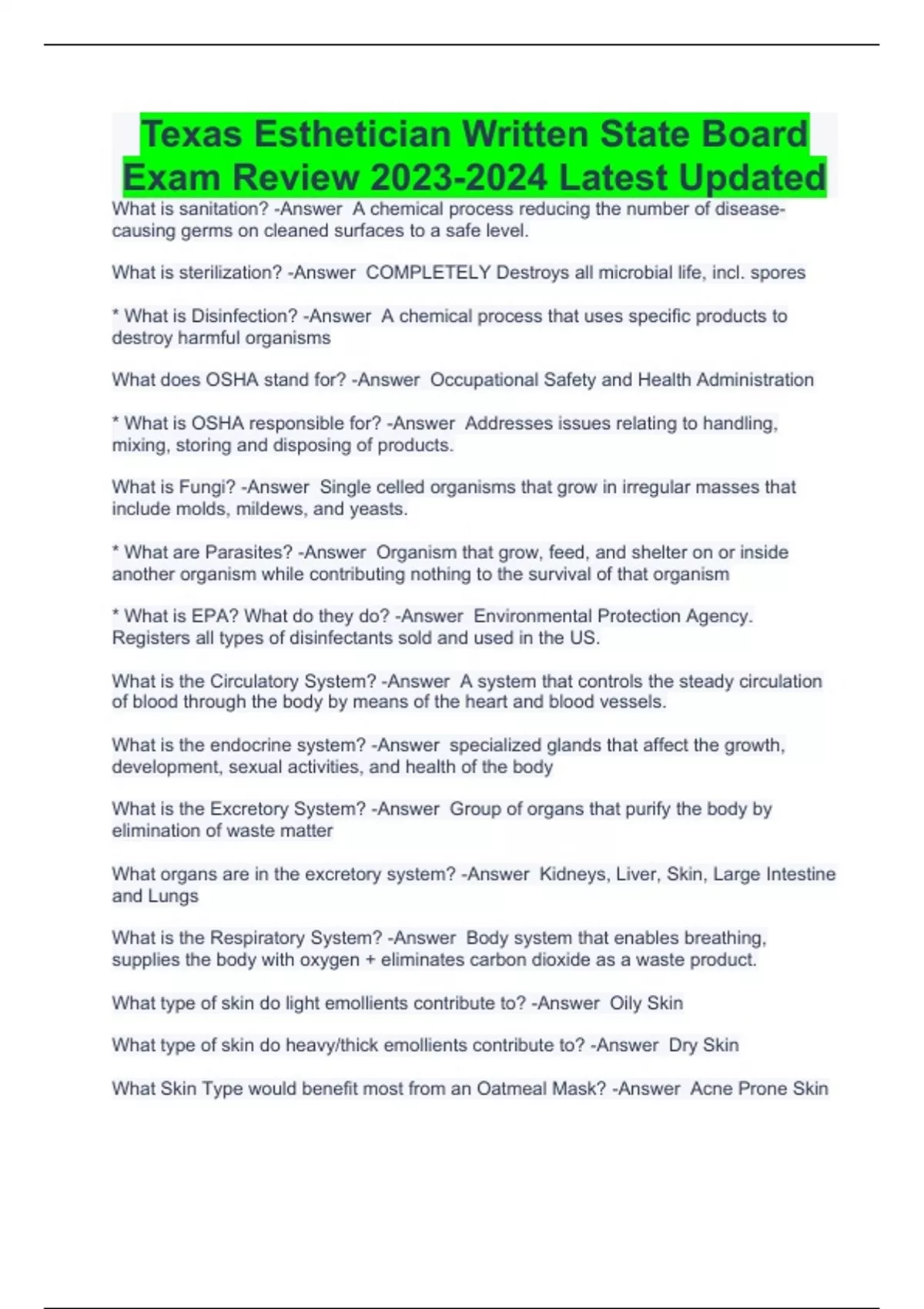 What is sanitation? -Answer A chemical process reducing the number of disease-causing germs on cleaned surfaces to a safe level. What is sterilization? -Answer COMPLETELY Destroys all microbial life, incl. spores * What is Disinfection? -Answer A chemical process that uses specific products to destroy harmful organisms What does OSHA stand for? -Answer Occupational Safety and Health Administration * What is OSHA responsible for? -Answer Addresses issues relating to handling, mixing, storing and disposing of products. What is Fungi? -Answer Single celled organisms that grow in irregular masses that include molds, mildews, and yeasts. * What are Parasites? -Answer Organism that grow, feed, and shelter on or inside another organism while contributing nothing to the survival of that organism * What is EPA? What do they do? -Answer Environmental Protection Agency. Registers all types of disinfectants sold and used in the US. What is the Circulatory System? -Answer A system that controls the steady circulation of blood through the body by means of the heart and blood vessels. What is the endocrine system? -Answer specialized glands that affect the growth, development, sexual activities, and health of the body What is the Excretory System? -Answer Group of organs that purify the body by elimination of waste matter What organs are in the excretory system? -Answer Kidneys, Liver, Skin, Large Intestine and Lungs What is the Respiratory System? -Answer Body system that enables breathing, supplies the body with oxygen + eliminates carbon dioxide as a waste product. What type of skin do light emollients contribute to? -Answer Oily Skin What type of skin do heavy/thick emollients contribute to? -Answer Dry Skin What Skin Type would benefit most from an Oatmeal Mask? -Answer Acne Prone Skin