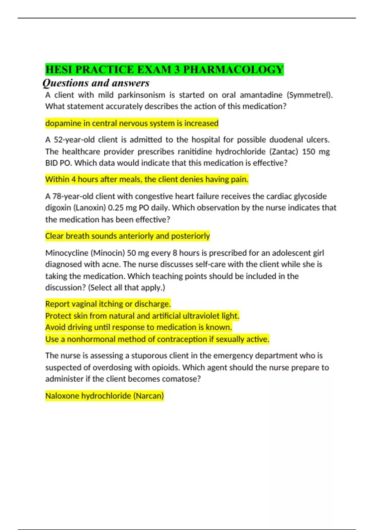 HESI PRACTICE EXAM 3 PHARMACOLOGY Questions and answers