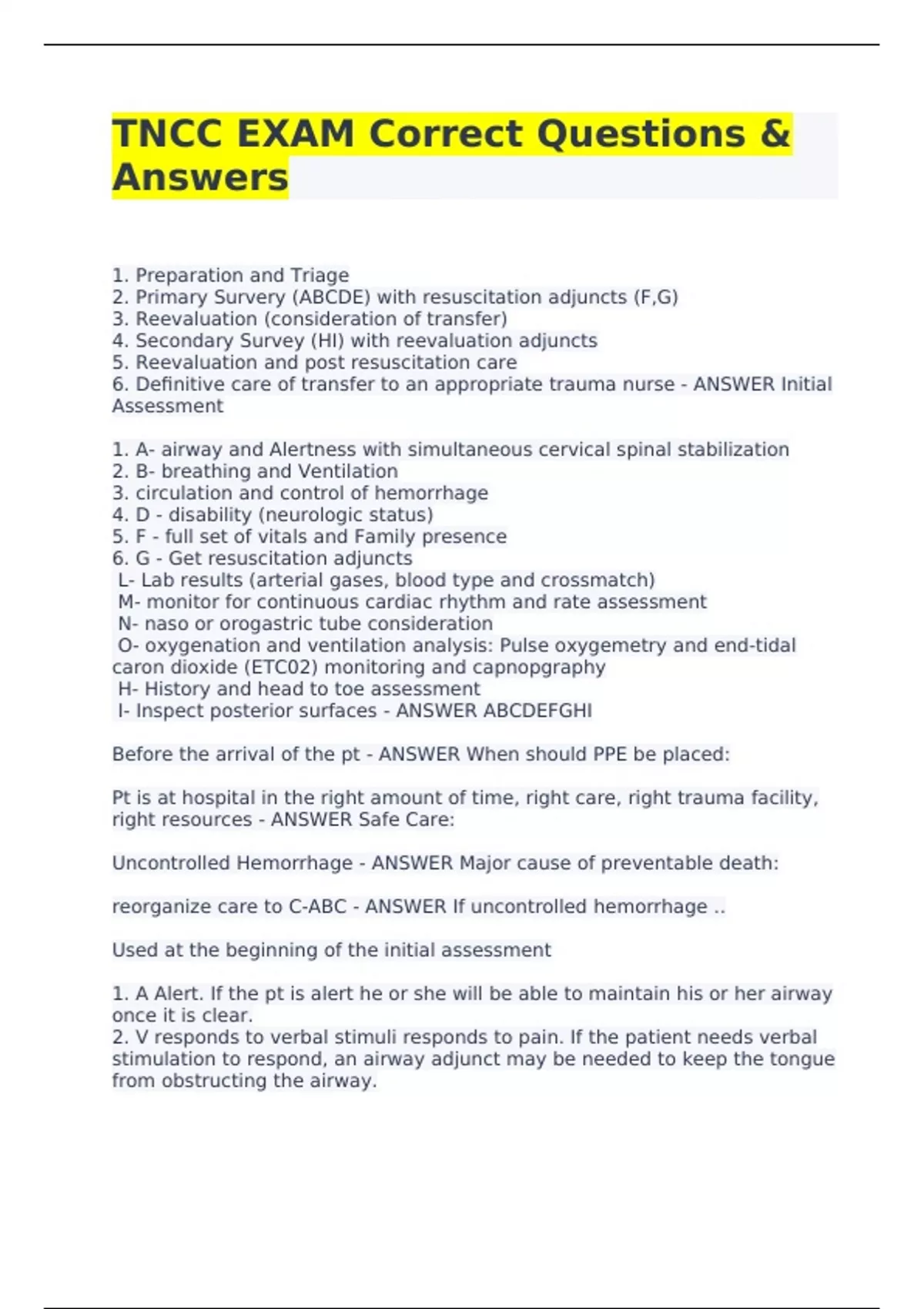 1. Preparation and Triage 2. Primary Survery (ABCDE) with resuscitation adjuncts (F,G) 3. Reevaluation (consideration of transfer) 4. Secondary Survey (HI) with reevaluation adjuncts 5. Reevaluation and post resuscitation care 6. Definitive care of transfer to an appropriate trauma nurse - ANSWER Initial Assessment 1. A- airway and Alertness with simultaneous cervical spinal stabilization 2. B- breathing and Ventilation 3. circulation and control of hemorrhage 4. D - disability (neurologic status) 5. F - full set of vitals and Family presence 6. G - Get resuscitation adjuncts L- Lab results (arterial gases, blood type and crossmatch) M- monitor for continuous cardiac rhythm and rate assessment N- naso or orogastric tube consideration O- oxygenation and ventilation analysis: Pulse oxygemetry and end-tidal caron dioxide (ETC02) monitoring and capnopgraphy H- History and head to toe assessment I- Inspect posterior surfaces - ANSWER ABCDEFGHI Before the arrival of the pt - ANSWER When should PPE be placed: Pt is at hospital in the right amount of time, right care, right trauma facility, right resources - ANSWER Safe Care: Uncontrolled Hemorrhage - ANSWER Major cause of preventable death: reorganize care to C-ABC - ANSWER If uncontrolled hemorrhage .. Used at the beginning of the initial assessment 1. A Alert. If the pt is alert he or she will be able to maintain his or her airway once it is clear. 2. V responds to verbal stimuli responds to pain. If the patient needs verbal stimulation to respond, an airway adjunct may be needed to keep the tongue from obstructing the