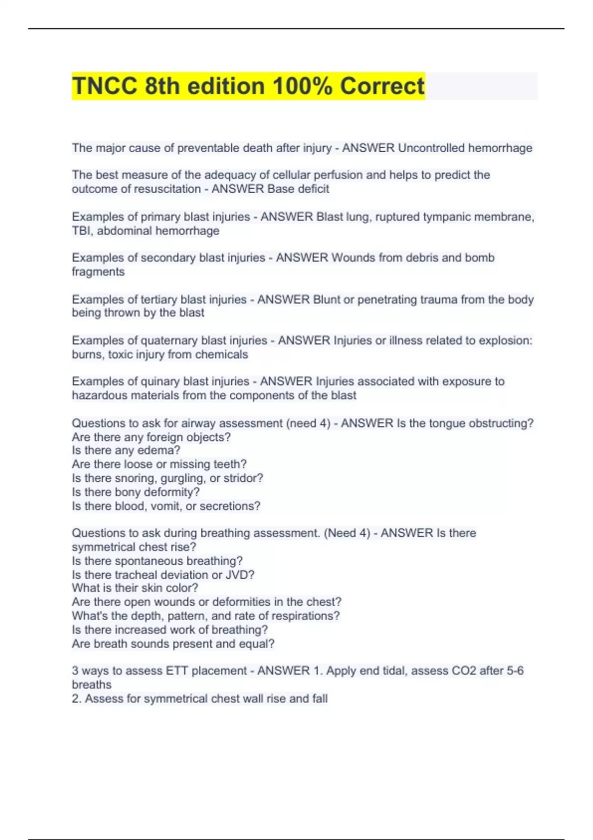 The major cause of preventable death after injury - ANSWER Uncontrolled hemorrhage The best measure of the adequacy of cellular perfusion and helps to predict the outcome of resuscitation - ANSWER Base deficit Examples of primary blast injuries - ANSWER Blast lung, ruptured tympanic membrane, TBI, abdominal hemorrhage Examples of secondary blast injuries - ANSWER Wounds from debris and bomb fragments Examples of tertiary blast injuries - ANSWER Blunt or penetrating trauma from the body being thrown by the blast Examples of quaternary blast injuries - ANSWER Injuries or illness related to explosion: burns, toxic injury from chemicals Examples of quinary blast injuries - ANSWER Injuries associated with exposure to hazardous materials from the components of the blast Questions to ask for airway assessment (need 4) - ANSWER Is the tongue obstructing? Are there any foreign objects? Is there any edema? Are there loose or missing teeth? Is there snoring, gurgling, or stridor? Is there bony deformity? Is there blood, vomit, or secretions?