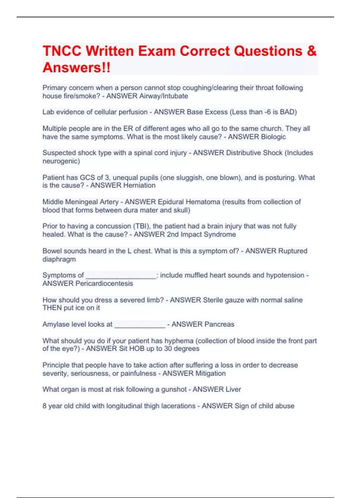 Primary concern when a person cannot stop coughing/clearing their throat following house fire/smoke? - ANSWER Airway/Intubate Lab evidence of cellular perfusion - ANSWER Base Excess (Less than -6 is BAD) Multiple people are in the ER of different ages who all go to the same church. They all have the same symptoms. What is the most likely cause? - ANSWER Biologic Suspected shock type with a spinal cord injury - ANSWER Distributive Shock (Includes neurogenic) Patient has GCS of 3, unequal pupils (one sluggish, one blown), and is posturing. What is the cause? - ANSWER Herniation Middle Meningeal Artery - ANSWER Epidural Hematoma (results from collection of blood that forms between dura mater and skull) Prior to having a concussion (TBI), the patient had a brain injury that was not fully healed. What is the cause? - ANSWER 2nd Impact Syndrome Bowel sounds heard in the L chest. What is this a symptom of? - ANSWER Ruptured diaphragm Symptoms of __________________: include muffled heart sounds and hypotension - ANSWER Pericardiocentesis How should you dress a severed limb? - ANSWER Sterile gauze with normal saline THEN put ice on it Amylase level looks at _____________ - ANSWER Pancreas What should you do if your patient has hyphema (collection of blood inside the front part of the eye?) - ANSWER Sit HOB up to 30 degrees Principle that people have to take action after suffering a loss in order to decrease severity, seriousness, or painfulness - ANSWER Mitigation What organ is most at risk following a gunshot - ANSWER Liver 8 year old child with longitudinal thigh lacerations - ANSWER Sign of child abuse Bleeding around belly button - ANSWER Cullen's Sign