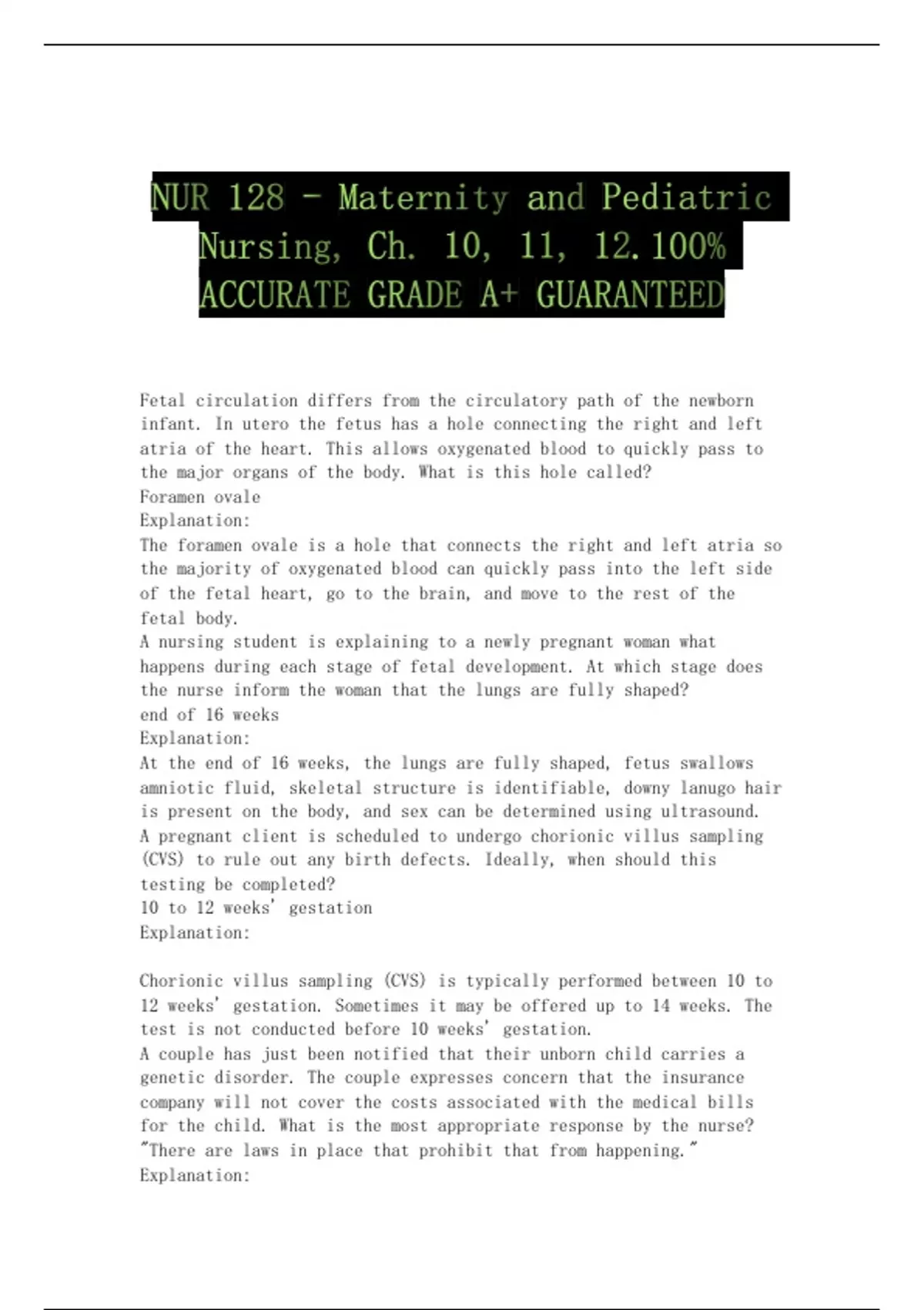 NUR 128 - Maternity and Pediatric Nursing, Ch. 10, 11, 12.100% ACCURATE GRADE A+ GUARANTEED