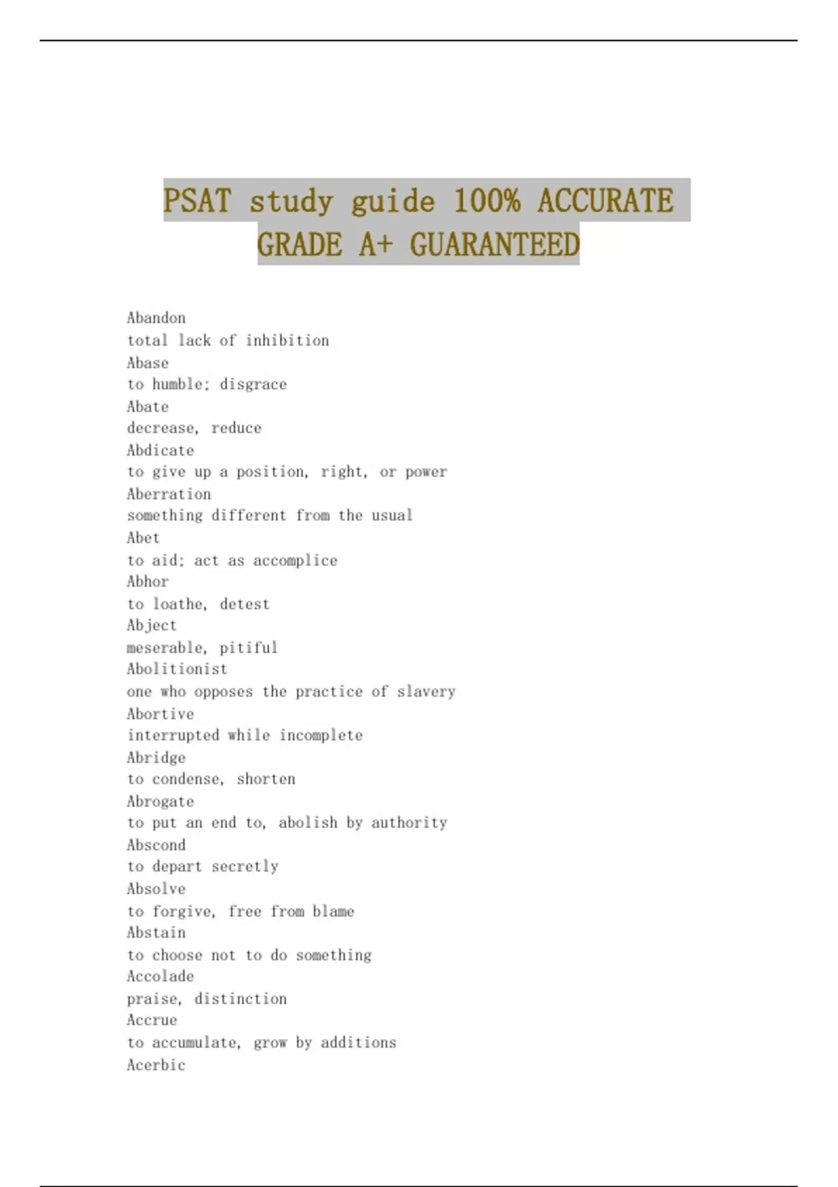 Abandon total lack of inhibition Abase to humble; disgrace Abate decrease, reduce Abdicate to give up a position, right, or power Aberration something different from the usual Abet to aid; act as accomplice Abhor to loathe, detest Abject meserable, pitiful Abolitionist one who opposes the practice of slavery Abortive interrupted while incomplete Abridge to condense, shorten Abrogate to put an end to, abolish by authority Abscond to depart secretly Absolve to forgive, free from blame Abstain to choose not to do something Accolade praise, distinction Accrue to accumulate, grow by additions Acerbic bitter, sharp in taste or temper Acme highesst point; summit Acquiesce to agree; comply quietly Acrid harsh, bitter Acrimony bitterness, animosity Acuity sharpness Acumen sharpness of insight Adage old saying or proveb Adamant uncompromising, unyielding Adapt to accommodate; adjust Adhere to cling or follow without deviation Adjacent next to Admonish to causion or reprimand Adroit skillful, accomplished, highly competent Adulation high praise Adumbrate to sketch, outline in a shadowy way Adversarial antagonistic, competitive Aerie nook or nest built high in the air Aesthetic pertaining to beauty or art Affable friendly, easy to approach Affected pretentious, phony Affluent rich, abundant Affront personal offense, insult Agenda plan, schedule Agile well coordinated, nimble Agitation commotion, excitement; uneasiness Agrarian relating to farming or rural matters Alacrity cheerful willingness, eagerness; speed Alias assumed name Alienated distanced, estranged Allegory symbolic representation Alleviate to relieve, improve partially Allure to entice by charm; attract Allusion indirect reference Aloof detached, indifferent Altruism unselfish concern for others' welfare Ambiguous uncertain; subject to multiple interpretation Ambivalence attitude of uncertainty; confliscting emotions Ameliorate to make better, improve Amend to improve or correct flaws in Amenity pleasantness; something increasing comfort Amiable friendly, pleasant, likable Amicable friendly, agreeable Amoral unprincipled, unethical Amorphous having no definite form Amphibian creature equally at home on land or in water Ample abundant, plentiful Amulet ornament worn as a charm against evil spirits Anachronistic out of date Anarchy absence of government or law; chaos Animation enthusiasm, excitement Animosity hatred, hostility Annul to cancel, nullify, declare void, or make legally invalid Anomaly irregularity or deviation from the norm Anonymity condition of haying no name or an unknown Antagonist foe, opponent, adversary Antecedent coming before in place or time Anthology collection of literary works Antipathy dislike, hostility; extreme opposition or aversion Antiquated outdated, obsolete Antiquity ancient times; the quality of being old Antithesis exact opposite or direct contrast Apathy lack of feeling or emotion Aphorism old saying or short, pithy statement Apocryphal not genuine; fictional Appease to satisfy, placate, calm, pacify Approbation praise; official approval Appropriate to take possession of Aprable suitable for cultivation Arbitrary depending solely on individual will; inconsistent Apboreal relating to trees; living in trees Arcane secret, obscure, known only to a few Archaic antiquated, from an earlier time; outdated Archipelago large group of islands Ardent passionate, enthusiastic, fervent Arduous extreme difficulty, laborious Arid extremely dry or deathly boring Arsenal ammunition storehouse Articulate well spoken, expressing oneself clearly Artisan craftsperson; expert Ascend to rise or climb Ascetic self-denying, abstinent, austere Ashen resembling ashes; pale Askew crooked, tilted Aspersion false rumor, damaging report, slander Aspire to have great hopes; to aim at a goal Assail to attack, assault Assiduous diligent, persistent, hard-working Assuage