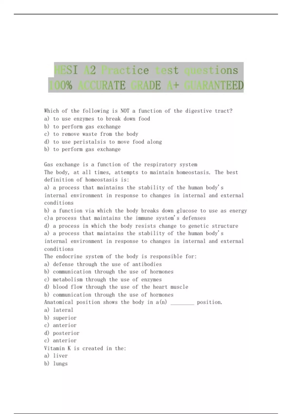 Which of the following is NOT a function of the digestive tract? a) to use enzymes to break down food b) to perform gas exchange c) to remove waste from the body d) to use peristalsis to move food along b) to perform gas exchange Gas exchange is a function of the respiratory system The body, at all times, attempts to maintain homeostasis. The best definition of homeostasis is: a) a process that maintains the stability of the human body's internal environment in response to changes in internal and external conditions b) a function via which the body breaks down glucose to use as energy c)a process that maintains the immune system's defenses d) a process in which the body resists change to genetic structure a) a process that maintains the stability of the human body's internal environment in response to changes in internal and external conditions The endocrine system of the body is responsible for: a) defense through the use of antibodies b) communication through the use of hormones c) metabolism through the use of enzymes d) blood flow through the use of the heart muscle b) communication through the use of hormones Anatomical position shows the body in a(n) ________ position. a) lateral b) superior c) anterior d) posterior c) anterior Vitamin K is created in the: a) liver b) lungs c) intestinal tract d) pancreas c) intestinal tract The largest organ in the body is the ________. a) skin b) GI tract c) femur d) stomach a) skin A medical scientists wants to study the parenchyma of the kidney. This scientist would correctly be known, most specifically, as a: a) biologist b) doctor c) anatomist d) histologist d) histologist Histology is the study of tissues. What is Erythropoiesis? a) red blood cell formation b) white blood cell formation c) the destruction of red blood cells d) the destruction of white blood cells a) red blood cell formation Blood cell formation is called Hemopoiesis. Erythro- red blood cells In which part of the body is keratin NOT found? a) hair b) skin c) nails d) teeth d) teeth Keratin is a family of fibrous structural proteins. Keratin is the key structural component of hair, nails, and the outer layer of human skin What is the relationship between sarcomeres and muscle cells? a) sarcomeres are muscle cells b) sarcomeres contain muscle cells c) muscle cells contain myofibrils, which in turn are made up of sarcomeres d) muscle cells contain sarcomeres, which in turn are made up of myofibrils CONTINUED......