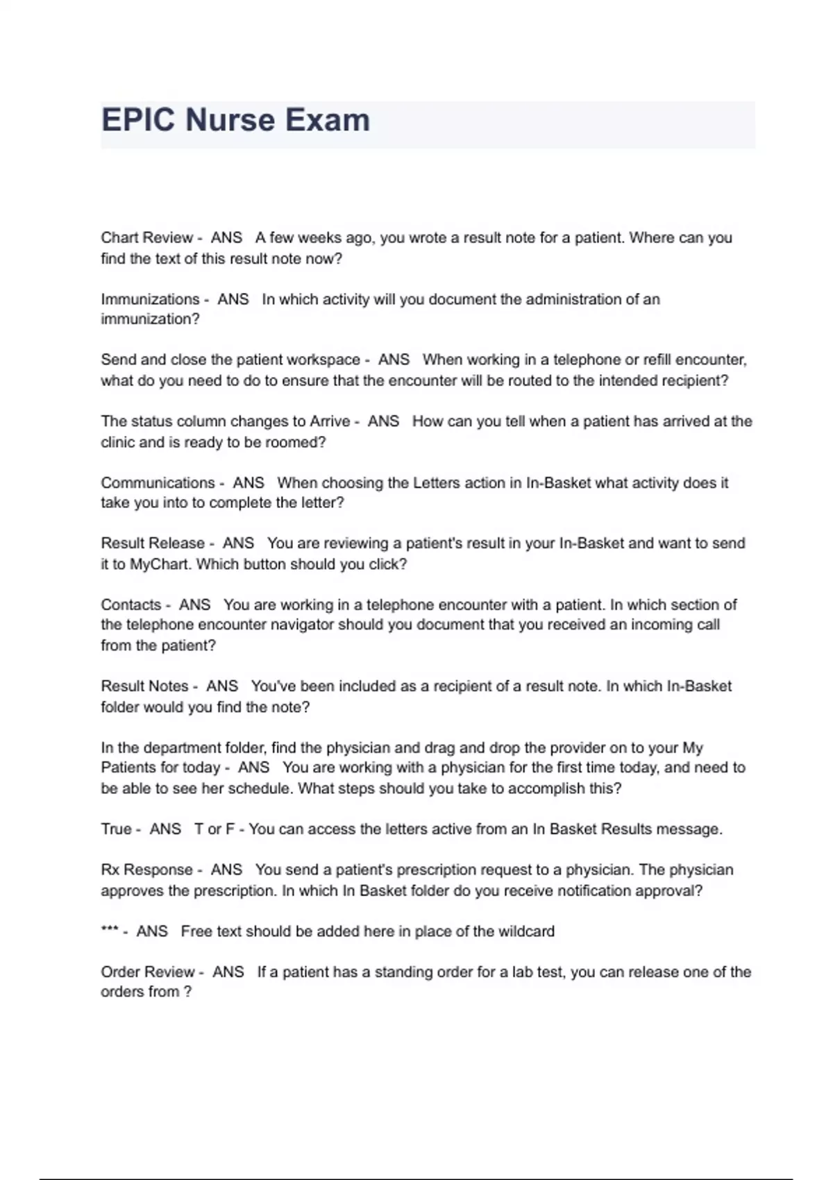 EPIC Nurse Exam Questions And Answers Chart Review - ANS A few weeks ago, you wrote a result note for a patient. Where can you find the text of this result note now? Immunizations - ANS In which activity will you document the administration of an immunization? Send and close the patient workspace - ANS When working in a telephone or refill encounter, what do you need to do to ensure that the encounter will be routed to the intended recipient? The status column changes to Arrive - ANS How can you tell when a patient has arrived at the clinic and is ready to be roomed? Communications - ANS When choosing the Letters action in In-Basket what activity does it take you into to complete the letter? Result Release - ANS You are reviewing a patient's result in your In-Basket and want to send it to MyChart. Which button should you click? Contacts - ANS You are working in a telephone encounter with a patient. In which section of the telephone encounter navigator should you document that you received an incoming call from the patient?