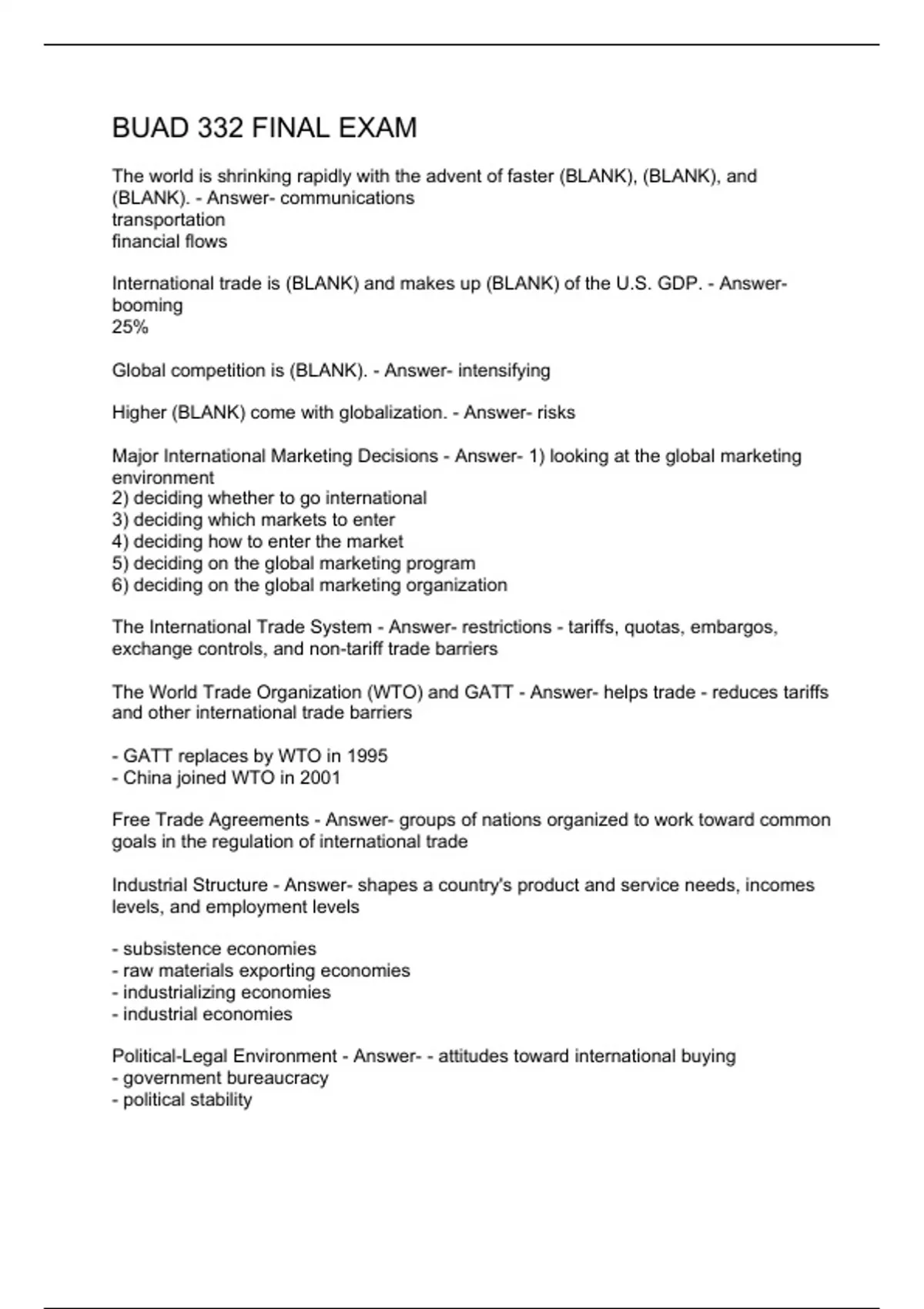 The world is shrinking rapidly with the advent of faster (BLANK), (BLANK), and (BLANK). - Answer- communications transportation financial flows International trade is (BLANK) and makes up (BLANK) of the U.S. GDP. - Answer- booming 25% Global competition is (BLANK). - Answer- intensifying Higher (BLANK) come with globalization. - Answer- risks Major International Marketing Decisions - Answer- 1) looking at the global marketing environment 2) deciding whether to go international 3) deciding which markets to enter 4) deciding how to enter the market 5) deciding on the global marketing program 6) deciding on the global marketing organization The International Trade System - Answer- restrictions - tariffs, quotas, embargos, exchange controls, and non-tariff trade barriers The World Trade Organization (WTO) and GATT - Answer- helps trade - reduces tariffs and other international trade barriers - GATT replaces by WTO in 1995 - China joined WTO in 2001 Free Trade Agreements - Answer- groups of nations organized to work toward common goals in the regulation of international trade Industrial Structure - Answer- shapes a country's product and service needs, incomes levels, and employment levels - subsistence economies - raw materials exporting economies - industrializing economies - industrial economies Political-Legal Environment - Answer- - attitudes toward international buying - government bureaucracy - political