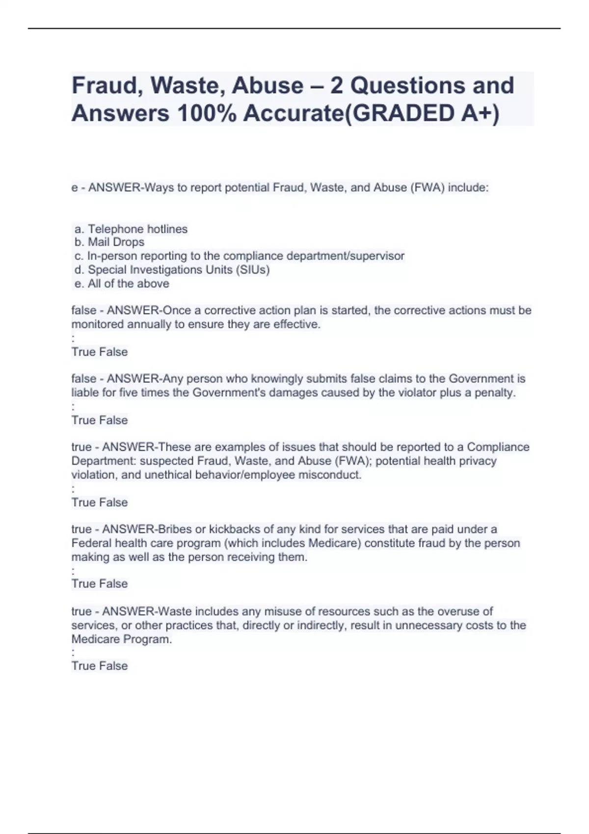 e - ANSWER-Ways to report potential Fraud, Waste, and Abuse (FWA) include: a. Telephone hotlines b. Mail Drops c. In-person reporting to the compliance department/supervisor d. Special Investigations Units (SIUs) e. All of the above false - ANSWER-Once a corrective action plan is started, the corrective actions must be monitored annually to ensure they are effective. : True False false - ANSWER-Any person who knowingly submits false claims to the Government is liable for five times the Government's damages caused by the violator plus a penalty. : True False true - ANSWER-These are examples of issues that should be reported to a Compliance Department: suspected Fraud, Waste, and Abuse (FWA); potential health privacy violation, and unethical behavior/employee misconduct. : True False true - ANSWER-Bribes or kickbacks of any kind for services that are paid under a Federal health care program (which includes Medicare) constitute fraud by the person making as well as the person receiving them. : True False true - ANSWER-Waste includes any misuse of resources such as the overuse of services, or other practices that, directly or indirectly, result in unnecessary costs to the Medicare Program. :