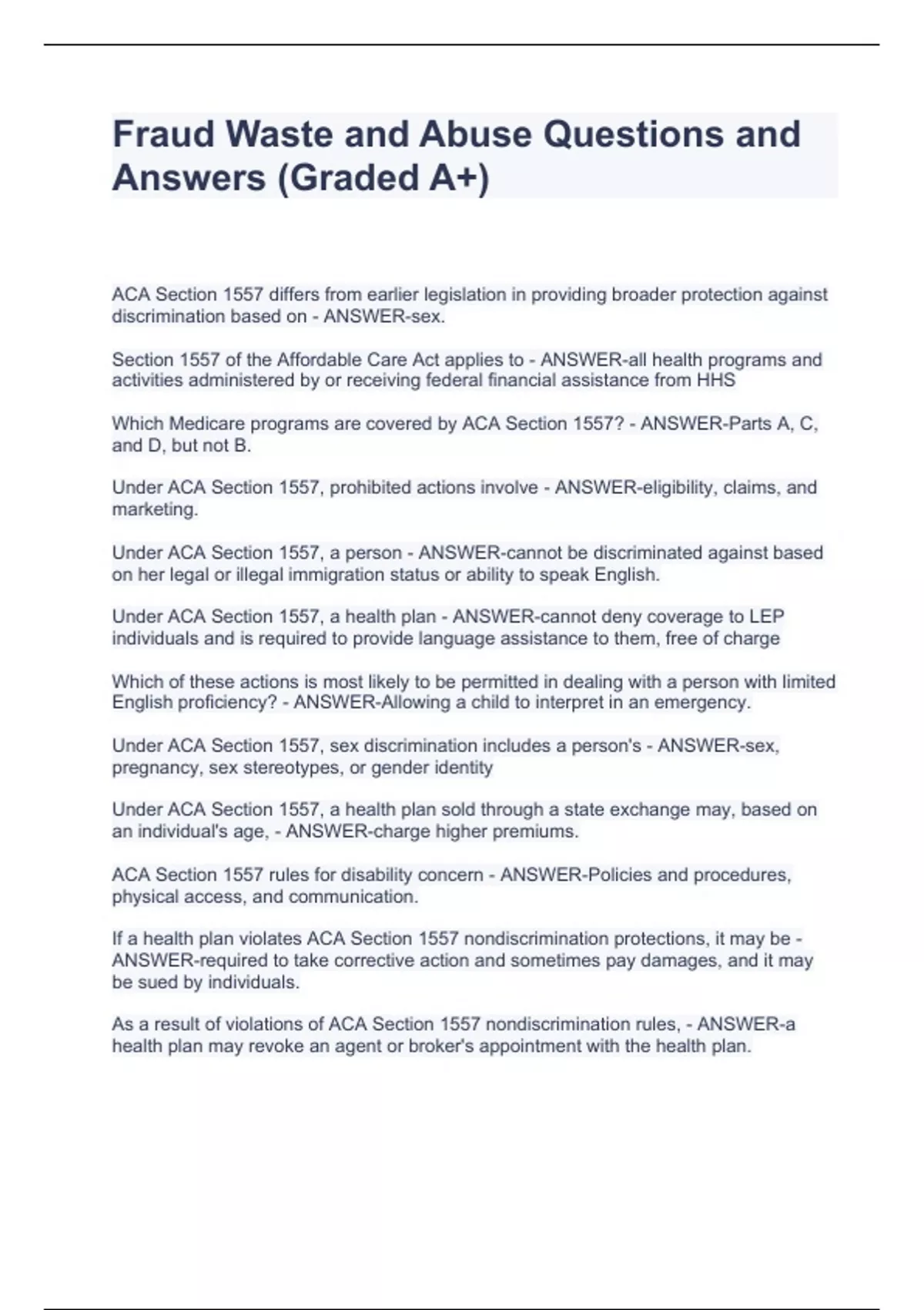 Fraud Waste and Abuse Questions and Answers (Graded A+)