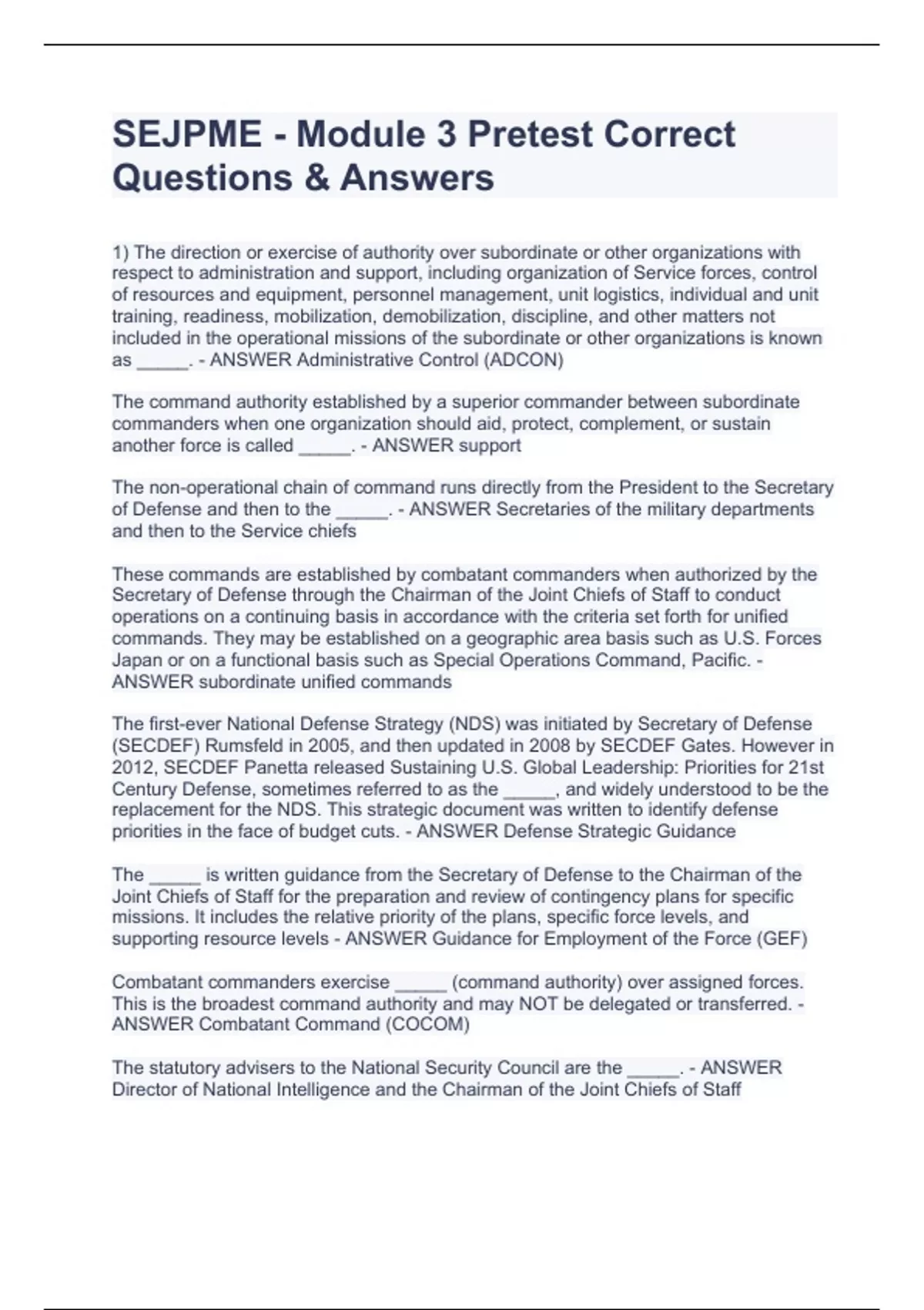 1) The direction or exercise of authority over subordinate or other organizations with respect to administration and support, including organization of Service forces, control of resources and equipment, personnel management, unit logistics, individual and unit training, readiness, mobilization, demobilization, discipline, and other matters not included in the operational missions of the subordinate or other organizations is known as _____. - ANSWER Administrative Control (ADCON) The command authority established by a superior commander between subordinate commanders when one organization should aid, protect, complement, or sustain another force is called _____. - ANSWER support The non-operational chain of command runs directly from the President to the Secretary of Defense and then to the _____. - ANSWER Secretaries of the military departments and then to the Service chiefs These commands are established by combatant commanders when authorized by the Secretary of Defense through the Chairman of the Joint Chiefs of Staff to conduct operations on a continuing basis in accordance with the criteria set forth for unified commands. They may be established on a geographic area basis such as U.S. Forces Japan or on a functional basis such as Special Operations Command, Pacific. - ANSWER subordinate unified commands The first-ever National Defense Strategy (NDS) was initiated by Secretary of Defense (SECDEF) Rumsfeld in 2005, and then updated in 2008 by SECDEF Gates. However in 2012, SECDEF Panetta released Sustaining U.S. Global Leadership: Priorities for 21st Century Defense, sometimes referred to as the _____, and widely understood to be the replacement for the NDS. This strategic document was written to identify defense priorities in the face of budget cuts. - ANSWER Defense Strategic Guidance The _____ is written guidance from the Secretary of Defense to the Chairman of the Joint Chiefs of Staff for the preparation and review of contingency plans for specific missions. It includes the relative priority of the plans,