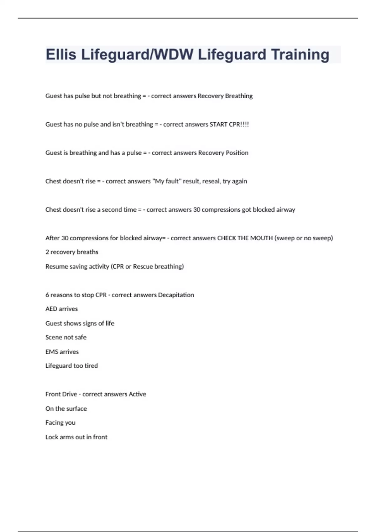 Ellis Lifeguard WDW Lifeguard Training Guest has pulse but not breathing = - correct answers Recovery Breathing Guest has no pulse and isn't breathing = - correct answers START CPR!!!! Guest is breathing and has a pulse = - correct answers Recovery Position Chest doesn't rise = - correct answers "My fault" result, reseal, try again Chest doesn't rise a second time = - correct answers 30 compressions got blocked airway After 30 compressions for blocked airway= - correct answers CHECK THE MOUTH (sweep or no sweep) 2 recovery breaths Resume saving activity (CPR or Rescue breathing) 6 reasons to stop CPR - correct answers Decapitation AED arrives Guest shows signs of life Scene not safe EMS arrives Lifeguard too tired Front Drive - correct answers Active On the surface Facing you Lock arms out in front Rear hug - correct answers Active On the surface Facing away from you Grab chest or toroso Duck pluck - correct answers Bottom of pool Grab and pull one arm up Tube under guest arm Two lifeguard save - correct answers Fist clenched "lifeguard need assistance" Back "ready? 1,2,3" - arms under armpits grab other tube Front - front drive