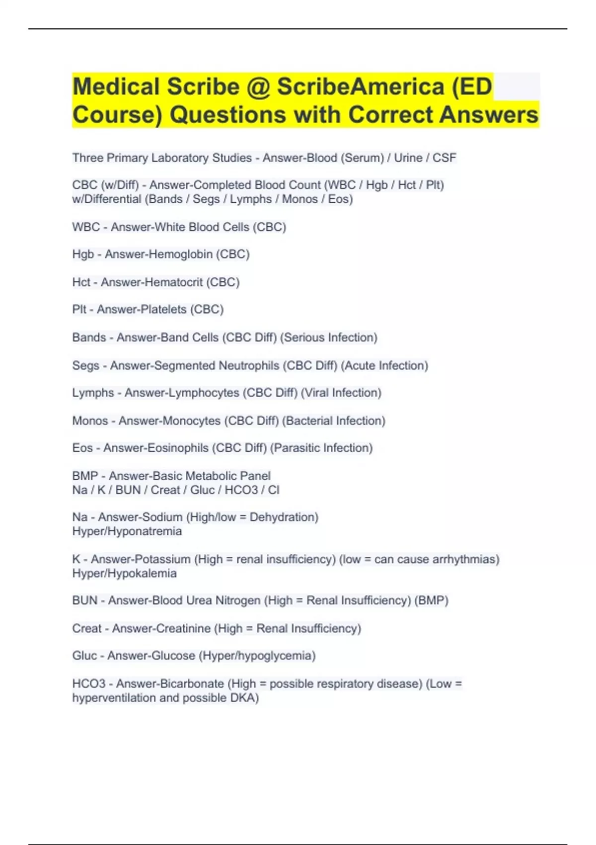 HCO3 - Answer-Bicarbonate (High = possible respiratory disease) (Low =