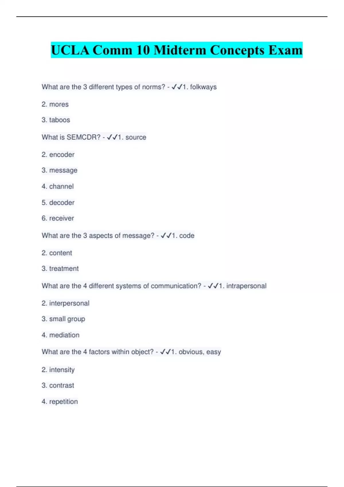 UCLA Comm 10 Midterm Concepts Exam What are the 3 different types of norms? - ️️ 1. folkways 2. mores 3. taboos What is SEMCDR? - ️️ 1. source 2. encoder 3. message 4. channel 5. decoder 6. receiver What are the 3 aspects of message? - ️️ 1. code 2. content 3. treatment What are the 4 different systems of communication? - ️️ 1. intrapersonal 2. interpersonal 3. small group 4. mediation What are the 4 factors within object? - ️️ 1. obvious, easy 2. intensity 3. contrast 4. repetition