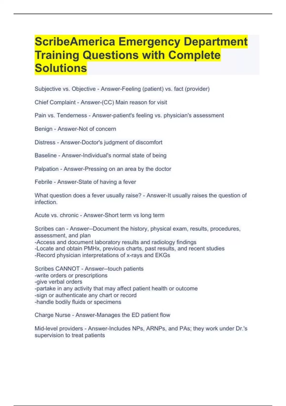 ScribeAmerica Emergency Department Training Questions with Complete Solutions