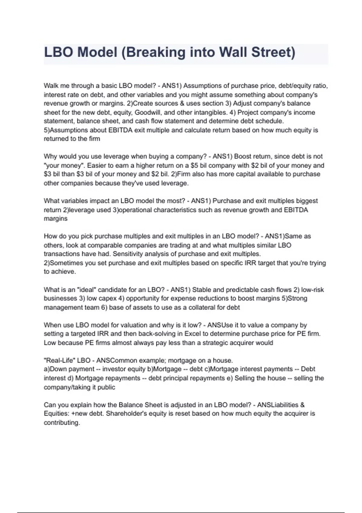 What variables impact an LBO model the most? - ANS1) Purchase and exit multiples biggest