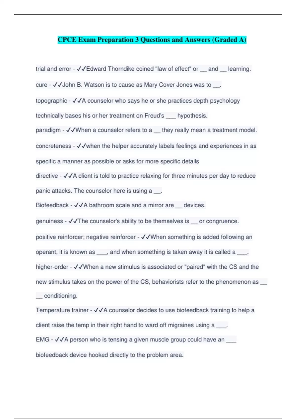 CPCE Exam Preparation 3 Questions and Answers (Graded A) trial and error - ️️ Edward Thorndike coined "law of effect" or __ and __ learning. cure - ️️ John B. Watson is to cause as Mary Cover Jones was to __. topographic - ️️ A counselor who says he or she practices depth psychology technically bases his or her treatment on Freud's ___ hypothesis. paradigm - ️️ When a counselor refers to a __ they really mean a treatment model. concreteness - ️️ when the helper accurately labels feelings and experiences in as specific a manner as possible or asks for more specific details directive - ️️ A client is told to practice relaxing for three minutes per day to reduce panic attacks. The counselor here is using a __. Biofeedback - ️️ A bathroom scale and a mirror are __ devices. genuiness - ️️ The counselor's ability to be themselves is __ or congruence. positive reinforcer; negative reinforcer - ️️ When something is added following an operant, it is known as ___, and when something is taken away it is called a ___. higher-order - ️️ When a new stimulus is associated or "paired" with the CS and the new stimulus takes on the power of the CS, behaviorists refer to the phenomenon as __ __ conditioning.